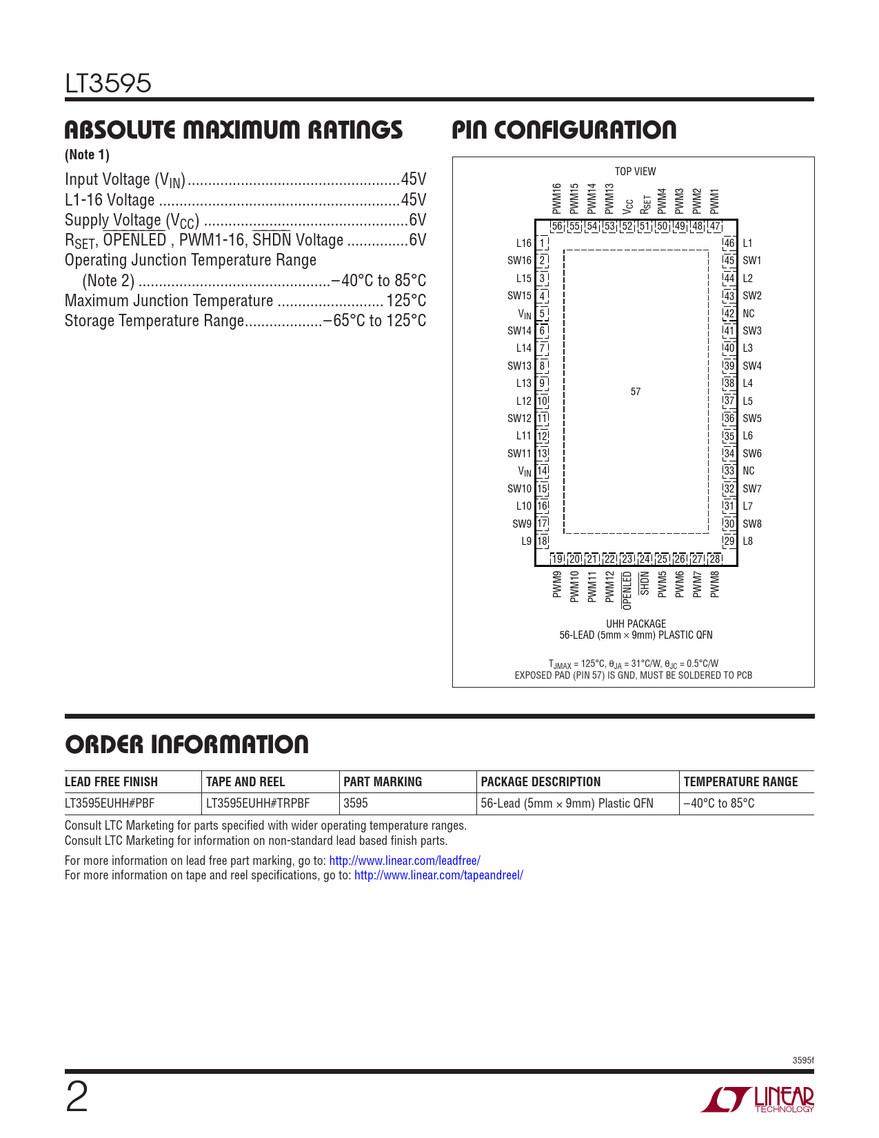 LT3595EUHH#PBF LT3595EUHH#TRPBF 3595 56-Lead (5mm × 9mm) Plastic QFN –40°C to 85°C Consult LTC Marketing for parts specifi ed with wider operating temperature ranges. Consult LTC Marketing for information on non-standard lead based fi nish parts. For more information on lead free part marking, go to: http://www.linear.com/leadfree/ For more information on tape and reel specifi cations, go to: http://www.linear.com/tapeandreel/ 3595f 2