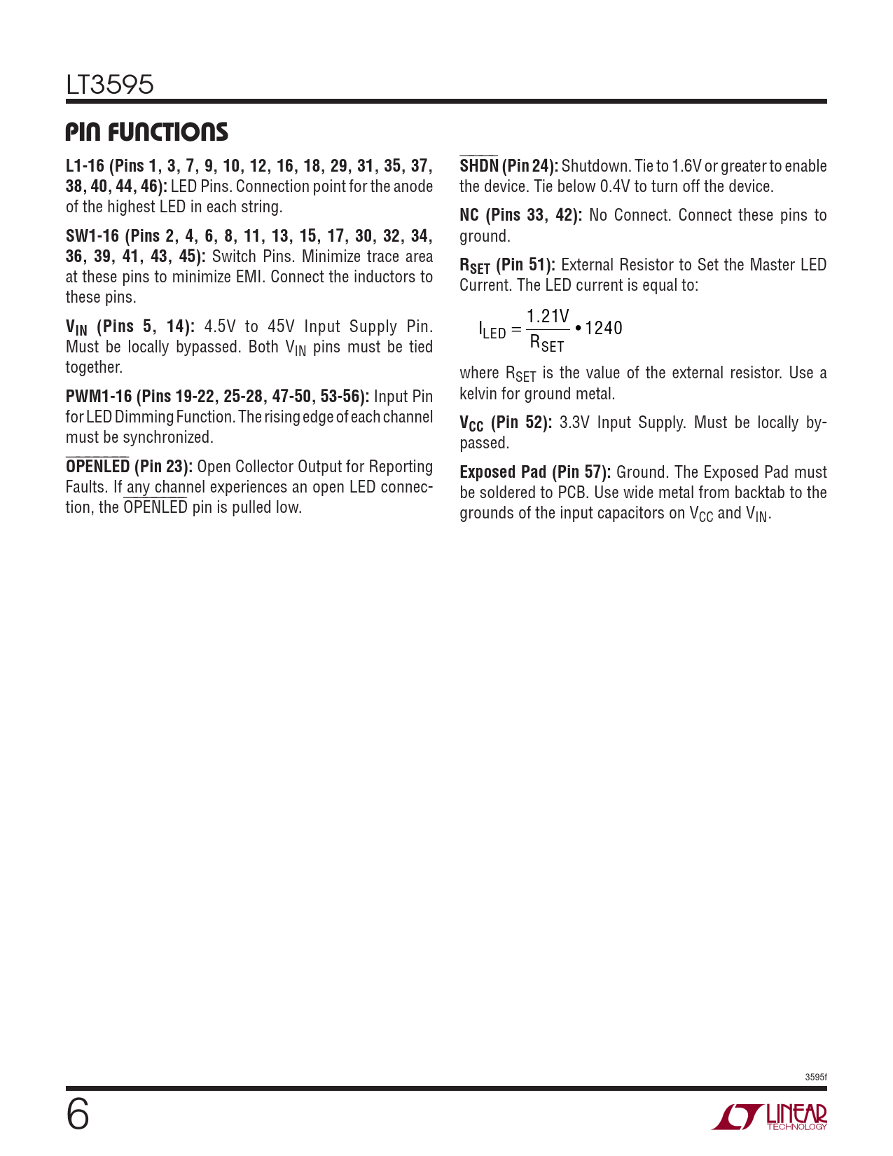 Ground. The Exposed Pad must Faults. If any channel experiences an open LED connec- be soldered to PCB. Use wide metal from backtab to the tion, the ⎯O⎯P⎯E⎯N⎯L⎯E⎯D pin is pulled low. grounds of the input capacitors on VCC and VIN. 3595f 6