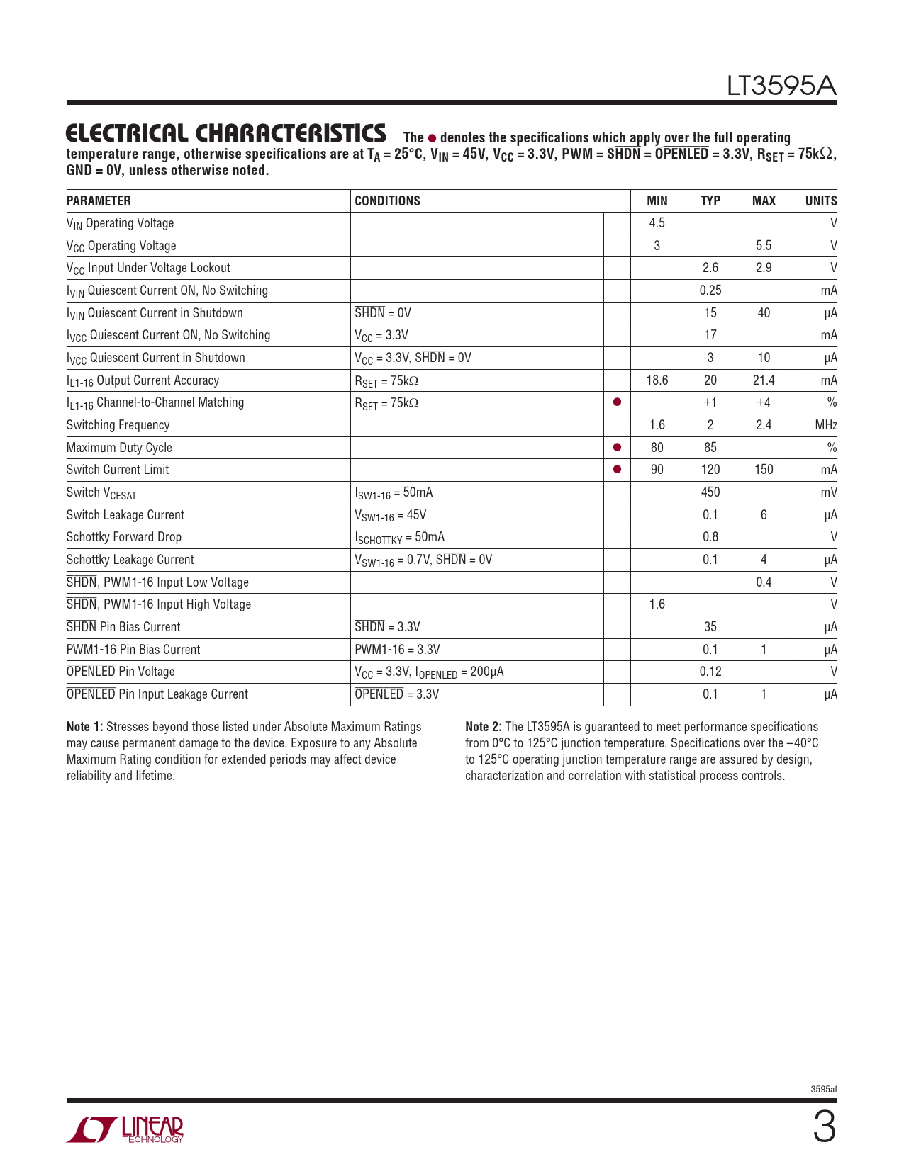 LT3595A ELECTRICAL CHARACTERISTICSThe l denotes the specifi cations which apply over the full operatingtemperature range, otherwise specifi cations are at TA = 25°C, VIN = 45V, VCC = 3.3V, PWM = SHDN = OPENLED = 3.3V, RSET = 75k Ω ,GND = 0V, unless otherwise noted.PARAMETERCONDITIONSMINTYPMAXUNITS VIN Operating Voltage 4.5 V VCC Operating Voltage 3 5.5 V VCC Input Under Voltage Lockout 2.6 2.9 V IVIN Quiescent Current ON, No Switching 0.25 mA IVIN Quiescent Current in Shutdown SHDN = 0V 15 40 μA IVCC Quiescent Current ON, No Switching VCC = 3.3V 17 mA IVCC Quiescent Current in Shutdown VCC = 3.3V, SHDN = 0V 3 10 μA IL1-16 Output Current Accuracy RSET = 75kΩ 18.6 20 21.4 mA IL1-16 Channel-to-Channel Matching RSET = 75kΩ l ±1 ±4 % Switching Frequency 1.6 2 2.4 MHz Maximum Duty Cycle l 80 85 % Switch Current Limit l 90 120 150 mA Switch VCESAT ISW1-16 = 50mA 450 mV Switch Leakage Current VSW1-16 = 45V 0.1 6 μA Schottky Forward Drop ISCHOTTKY = 50mA 0.8 V Schottky Leakage Current VSW1-16 = 0.7V, SHDN = 0V 0.1 4 μA SHDN, PWM1-16 Input Low Voltage 0.4 V SHDN, PWM1-16 Input High Voltage 1.6 V SHDN Pin Bias Current SHDN = 3.3V 35 μA PWM1-16 Pin Bias Current PWM1-16 = 3.3V 0.1 1 μA OPENLED Pin Voltage VCC = 3.3V, IOPENLED = 200μA 0.12 V OPENLED Pin Input Leakage Current OPENLED = 3.3V 0.1 1 μA Note 1: Stresses beyond those listed under Absolute Maximum Ratings Note 2: The LT3595A is guaranteed to meet performance specifi cations may cause permanent damage to the device. Exposure to any Absolute from 0°C to 125°C junction temperature. Specifi cations over the –40°C Maximum Rating condition for extended periods may affect device to 125°C operating junction temperature range are assured by design, reliability and lifetime. characterization and correlation with statistical process controls. 3595af 3