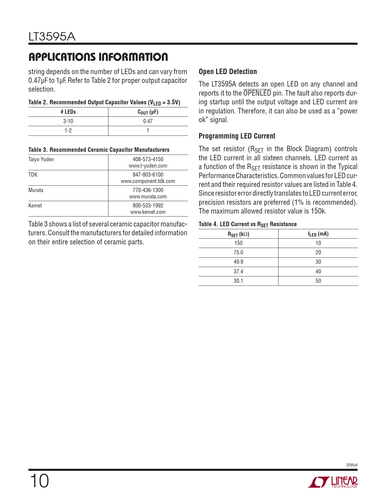 LT3595A APPLICATIONS INFORMATION string depends on the number of LEDs and can vary from Open LED Detection 0.47μF to 1μF. Refer to Table 2 for proper output capacitor The LT3595A detects an open LED on any channel and selection. reports it to the OPENLED pin. The fault also reports dur- Table 2. Recommended Output Capacitor Values (VLED = 3.5V) ing startup until the output voltage and LED current are # LEDsCOUT (μF) in regulation. Therefore, it can also be used as a “power 3-10 0.47 ok” signal. 1-2 1 Programming LED CurrentTable 3. Recommended Ceramic Capacitor Manufacturers The set resistor (RSET in the Block Diagram) controls Taiyo Yuden 408-573-4150 the LED current in all sixteen channels. LED current as www.t-yuden.com a function of the RSET resistance is shown in the Typical TDK 847-803-6100 Performance Characteristics. Common values for LED cur- www.component.tdk.com rent and their required resistor values are listed in Table 4. Murata 770-436-1300 Since resistor error directly translates to LED current error, www.murata.com precision resistors are preferred (1% is recommended). Kemet 800-533-1992 www.kemet.com The maximum allowed resistor value is 150k. Table 3 shows a list of several ceramic capacitor manufac- Table 4. LED Current vs RSET Resistance turers. Consult the manufacturers for detailed information RSET (k Ω )ILED (mA) on their entire selection of ceramic parts. 150 10 75.0 20 49.9 30 37.4 40 30.1 50 3595af 10