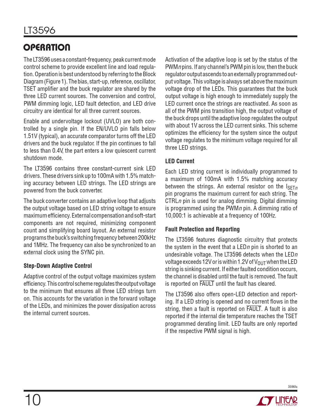 LT3596 operaTion The LT3596 uses a constant-frequency, peak current mode Activation of the adaptive loop is set by the status of the control scheme to provide excellent line and load regula- PWMn pins. If any channel’s PWM pin is low, then the buck tion. Operation is best understood by referring to the Block regulator output ascends to an external y programmed out- Diagram (Figure 1). The bias, start-up, reference, oscil ator, put voltage. This voltage is always set above the maximum TSET amplifier and the buck regulator are shared by the voltage drop of the LEDs. This guarantees that the buck three LED current sources. The conversion and control, output voltage is high enough to immediately supply the PWM dimming logic, LED fault detection, and LED drive LED current once the strings are reactivated. As soon as circuitry are identical for all three current sources. all of the PWM pins transition high, the output voltage of Enable and undervoltage lockout (UVLO) are both con- the buck drops until the adaptive loop regulates the output trolled by a single pin. If the EN/UVLO pin falls below with about 1V across the LED current sinks. This scheme 1.51V (typical), an accurate comparator turns off the LED optimizes the efficiency for the system since the output drivers and the buck regulator. If the pin continues to fall voltage regulates to the minimum voltage required for all to less than 0.4V, the part enters a low quiescent current three LED strings. shutdown mode.