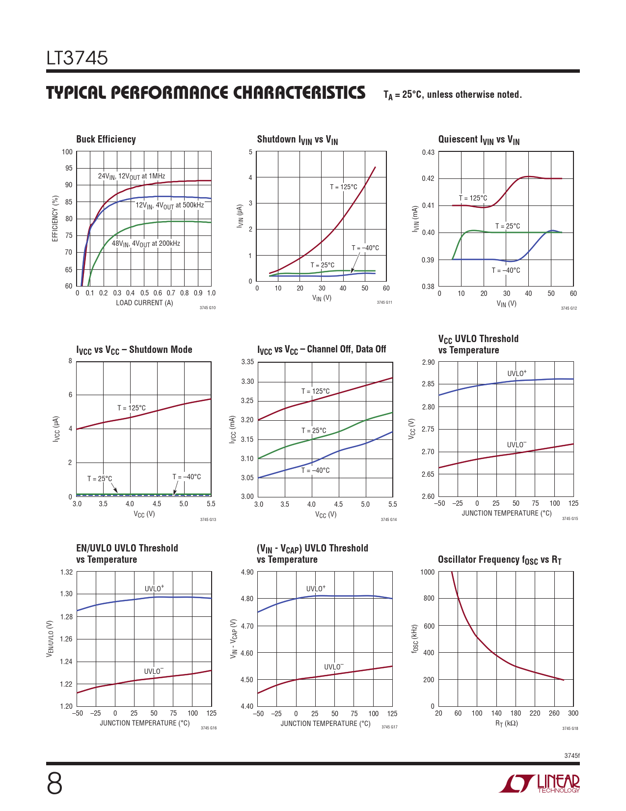8 3.35 2.90 UVLO+ 3.30 2.85 6 T = 125°C 3.25 T = 125°C 2.80 3.20 (µA) 4 (mA) T = 25°C (V) 2.75 I VCC I VCC 3.15 V CC UVLO– 2.70 2 3.10 T = –40°C T = 25°C T = –40°C 3.05 2.65 0 3.00 2.60 3.0 3.5 4.0 4.5 5.0 5.5 3.0 3.5 4.0 4.5 5.0 5.5 –50 –25 0 25 50 75 100 125 VCC (V) VCC (V) JUNCTION TEMPERATURE (°C) 3745 G13 3745 G14 3745 G15