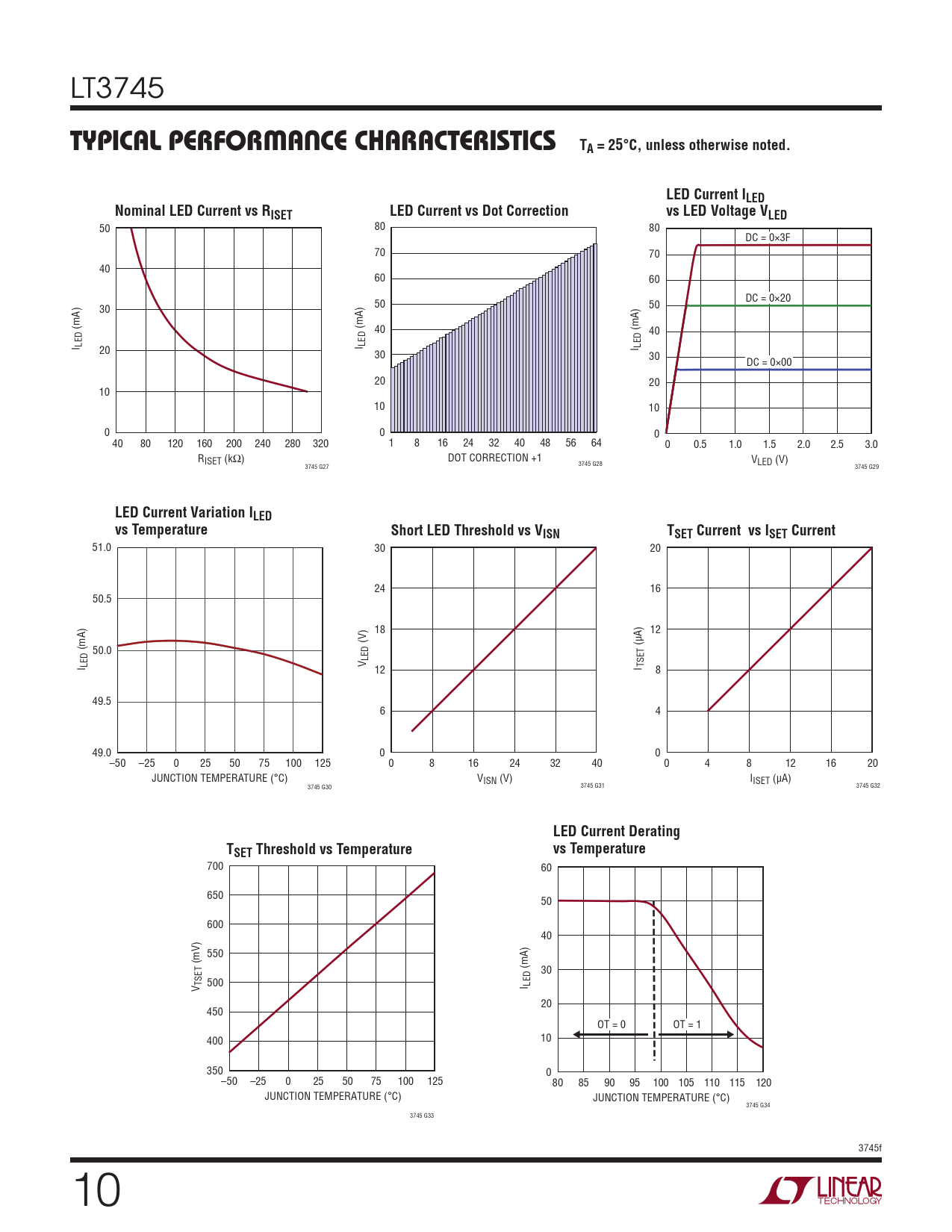 51.0 30 20 24 16 50.5 18 12 (V) (mA) 50.0 (µA) LED I LED V 12 I TSET 8 49.5 6 4 49.0 0 0 –50 –25 0 25 50 75 100 125 0 8 16 24 32 40 0 4 8 12 16 20 JUNCTION TEMPERATURE (°C) VISN (V) IISET (µA) 3745 G30 3745 G31 3745 G32