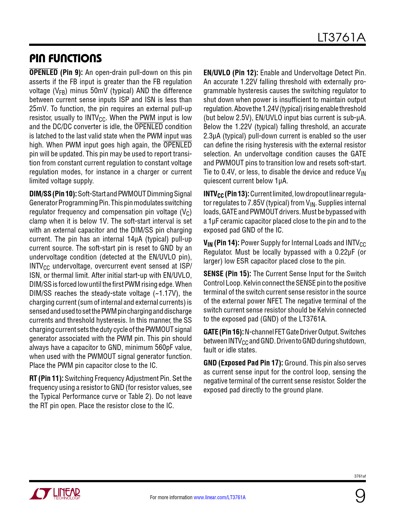 页数 / 页30 / 9 — pin FuncTions OPENLED (Pin 9):. EN/UVLO (Pin 12):. DIM/SS (Pin 10):. …