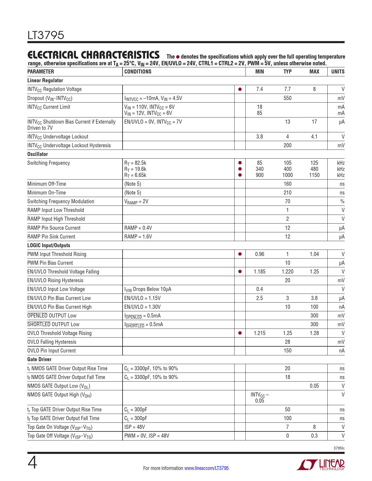 tr NMOS GATE Driver Output Rise Time CL = 3300pF, 10% to 90% 20 ns tf NMOS GATE Driver Output Fall Time CL = 3300pF, 10% to 90% 18 ns NMOS GATE Output Low (VOL) 0.05 V NMOS GATE Output High (VOH) INTVCC – V 0.05 tr Top GATE Driver Output Rise Time CL = 300pF 50 ns tf Top GATE Driver Output Fall Time CL = 300pF 100 ns Top Gate On Voltage (VISP-VTG) ISP = 48V 7 8 V Top Gate Off Voltage (VISP-VTG) PWM = 0V, ISP = 48V 0 0.3 V 3795fc 4 For more information www.linear.com/LT3795 Document Outline Features Applications Typical Application Description Absolute Maximum Ratings Pin Configuration Order Information Electrical Characteristics Typical Performance Characteristics Pin Functions Block Diagram Operation Applications Information Typical Applications Package Description Revision History Typical Application Related Parts