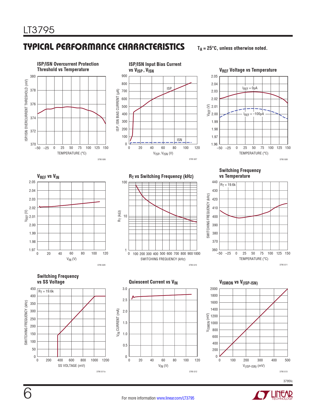380 900 2.05 800 2.04 I 378 ISP 700 REF = 0µA 2.03 600 2.02 376 500 2.01 (V) 400 2.00 V REF IREF = –100µA 374 300 1.99 372 ISP, ISN BIAS CURRENT (µA) 200 1.98 100 1.97 ISP/ISN OVERCURRENT THRESHOLD (mV) ISN 370 0 1.96 –50 –25 0 25 50 75 100 125 150 0 20 40 60 80 100 120 –50 –25 0 25 50 75 100 125 150 TEMPERATURE (°C) VISP, VISN (V) TEMPERATURE (°C) 3795 G06 3795 G07 3795 G08