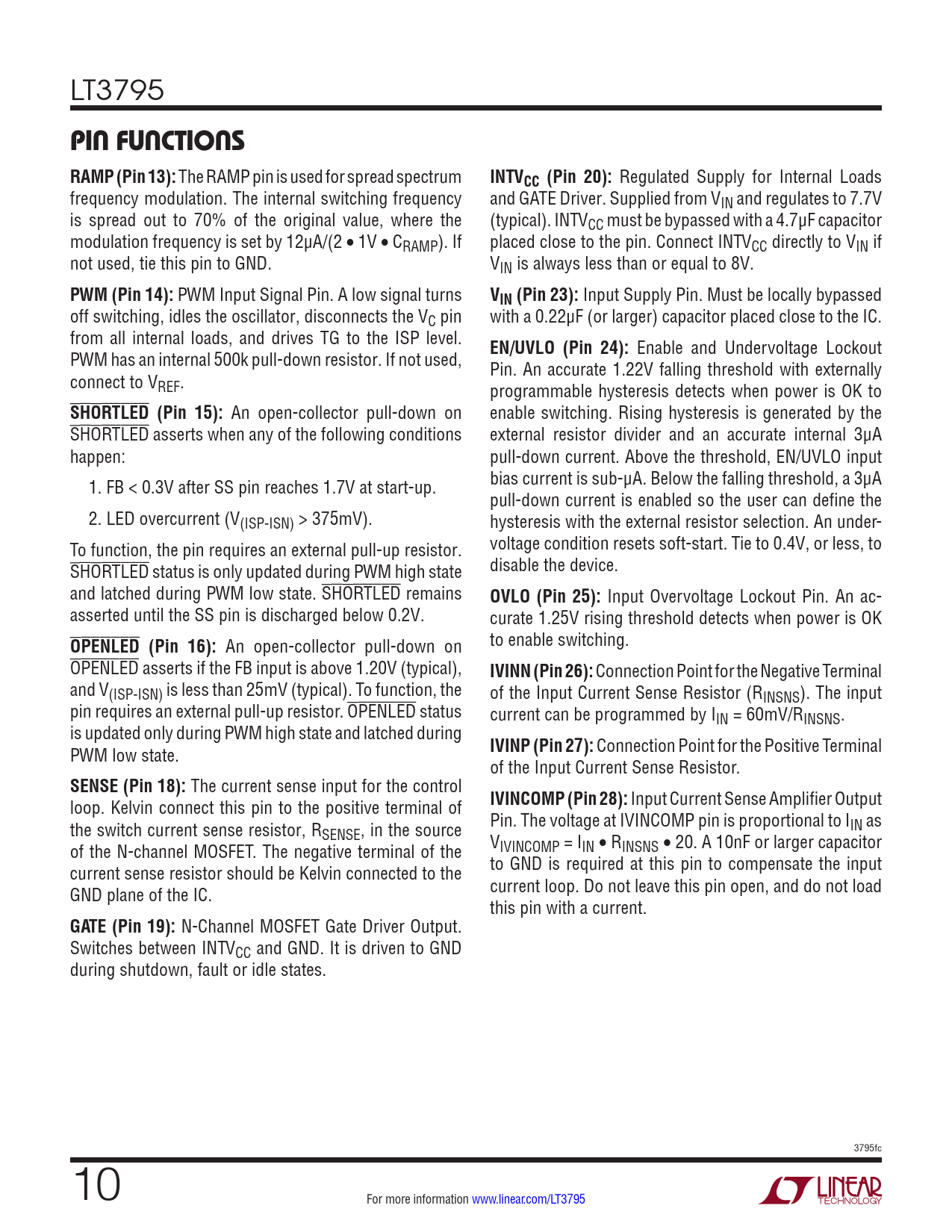 N-Channel MOSFET Gate Driver Output. Switches between INTVCC and GND. It is driven to GND during shutdown, fault or idle states. 3795fc 10 For more information www.linear.com/LT3795 Document Outline Features Applications Typical Application Description Absolute Maximum Ratings Pin Configuration Order Information Electrical Characteristics Typical Performance Characteristics Pin Functions Block Diagram Operation Applications Information Typical Applications Package Description Revision History Typical Application Related Parts