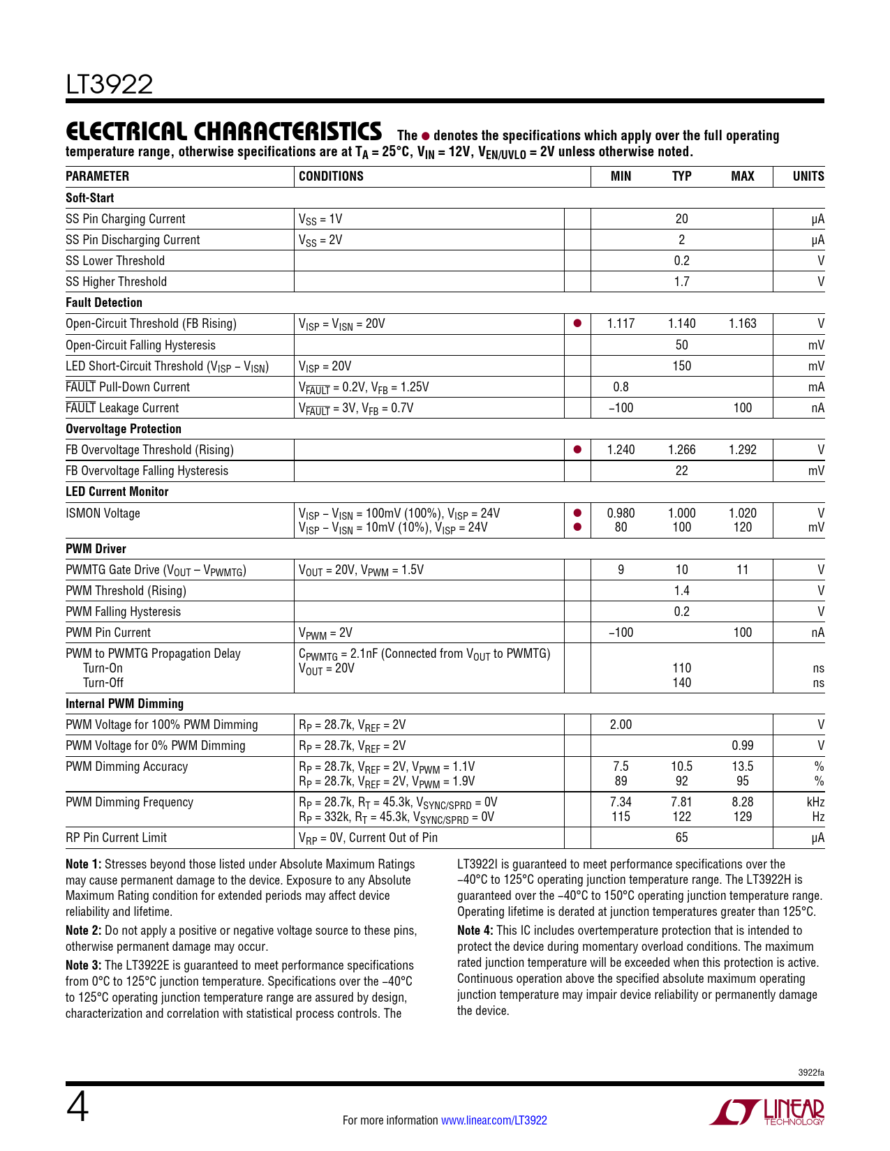 Stresses beyond those listed under Absolute Maximum Ratings LT3922I is guaranteed to meet performance specifications over the may cause permanent damage to the device. Exposure to any Absolute −40°C to 125°C operating junction temperature range. The LT3922H is Maximum Rating condition for extended periods may affect device guaranteed over the −40°C to 150°C operating junction temperature range. reliability and lifetime. Operating lifetime is derated at junction temperatures greater than 125°C.