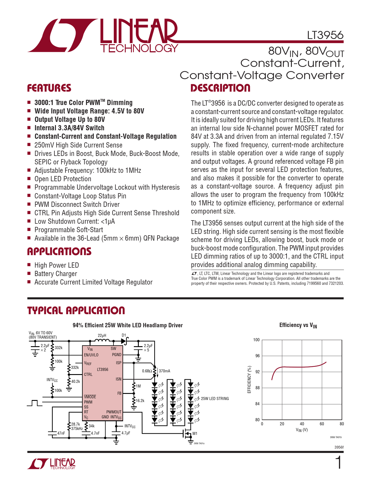 LT3956 80VIN, 80VOUT Constant-Current, Constant-Voltage Converter FeaTures DescripTion n 3000:1 True Color PWMTM Dimming The LT®3956 is a DC/DC converter designed to operate as n Wide Input Voltage Range: 4.5V to 80V a constant-current source and constant-voltage regulator. n Output Voltage Up to 80V It is ideally suited for driving high current LEDs. It features n Internal 3.3A/84V Switch an internal low side N-channel power MOSFET rated for n Constant-Current and Constant-Voltage Regulation 84V at 3.3A and driven from an internal regulated 7.15V n 250mV High Side Current Sense supply. The fixed frequency, current-mode architecture n Drives LEDs in Boost, Buck Mode, Buck-Boost Mode, results in stable operation over a wide range of supply SEPIC or Flyback Topology and output voltages. A ground referenced voltage FB pin n Adjustable Frequency: 100kHz to 1MHz serves as the input for several LED protection features, n Open LED Protection and also makes it possible for the converter to operate n Programmable Undervoltage Lockout with Hysteresis as a constant-voltage source. A frequency adjust pin n Constant-Voltage Loop Status Pin allows the user to program the frequency from 100kHz n PWM Disconnect Switch Driver to 1MHz to optimize efficiency, performance or external n CTRL Pin Adjusts High Side Current Sense Threshold component size. n Low Shutdown Current: <1µA The LT3956 senses output current at the high side of the n Programmable Soft-Start LED string. High side current sensing is the most flexible n Available in the 36-Lead (5mm × 6mm) QFN Package scheme for driving LEDs, allowing boost, buck mode or applicaTions buck-boost mode configuration. The PWM input provides LED dimming ratios of up to 3000:1, and the CTRL input n High Power LED provides additional analog dimming capability. n Battery Charger L, LT, LTC, LTM, Linear Technology and the Linear logo are registered trademarks and True Color PWM is a trademark of Linear Technology Corporation. All other trademarks are the n Accurate Current Limited Voltage Regulator property of their respective owners. Protected by U.S. Patents, including 7199560 and 7321203. Typical applicaTion 94% Efficient 25W White LED Headlamp DriverEfficiency vs VIN VIN, 6V TO 60V 22µH D1 (80V TRANSIENT) 100 2.2µF 332k 2.2µF V s IN SW s EN/UVLO PGND 96 100k VREF ISP 332k LT3956 0.68Ω 370mA 92 CTRL INTVCC 40.2k ISN 1M 88 100k FB EFFICIENCY (%) VMODE 16.2k 25W LED STRING PWM 84 SS RT PWMOUT VC GND INTVCC 80 28.7k 34k INTV 0 20 40 60 80 375kHz CC VIN (V) 47nF 4.7nF 4.7µF M1 3956 TA01b 3956 TA01a 3956f Document Outline Features Description Applications Typical Application Absolute Maximum Ratings Pin Configuration order information Electrical Characteristics Typical Performance Characteristics Pin Functions Block Diagram Operation Applications Information Typical Application Package Description Typical Application Related Parts