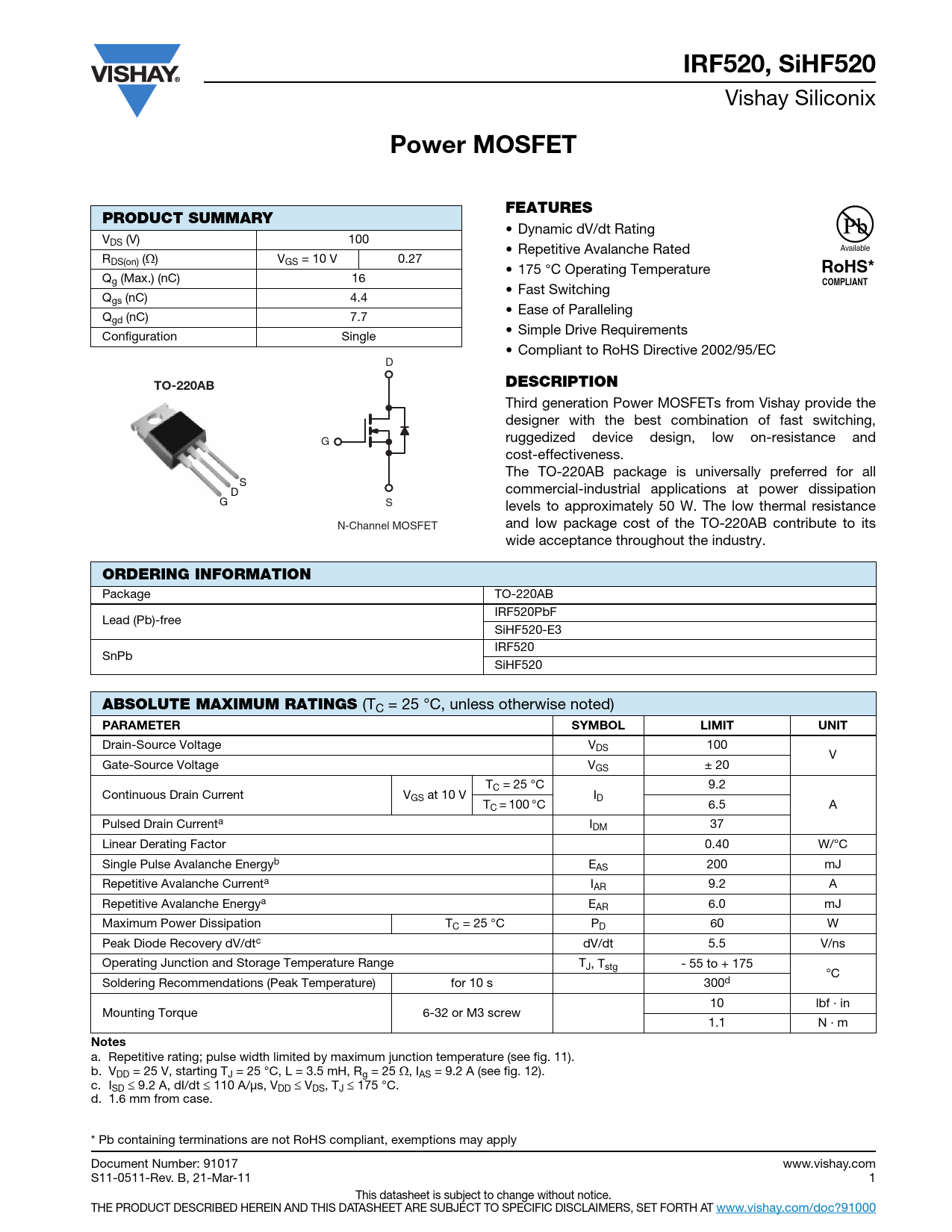 IRF520, SiHF520 Vishay Siliconix Power MOSFETFEATURESPRODUCT SUMMARY • Dynamic dV/dt Rating VDS (V) 100 • Repetitive Avalanche Rated Available RDS(on) () VGS = 10 V 0.27 • 175 °C Operating Temperature RoHS* Qg (Max.) (nC) 16 COMPLIANT • Fast Switching Qgs (nC) 4.4 • Ease of Paralleling Qgd (nC) 7.7 • Simple Drive Requirements Configuration Single • Compliant to RoHS Directive 2002/95/EC D TO-220ABDESCRIPTION Third generation Power MOSFETs from Vishay provide the designer with the best combination of fast switching, ruggedized device design, low on-resistance and G cost-effectiveness. The TO-220AB package is universally preferred for all S commercial-industrial applications at power dissipation D G S levels to approximately 50 W. The low thermal resistance N-Channel MOSFET and low package cost of the TO-220AB contribute to its wide acceptance throughout the industry. ORDERING INFORMATION Package TO-220AB IRF520PbF Lead (Pb)-free SiHF520-E3 IRF520 SnPb SiHF520 ABSOLUTE MAXIMUM RATINGS (TC = 25 °C, unless otherwise noted) PARAMETER SYMBOLLIMITUNIT Drain-Source Voltage VDS 100 V Gate-Source Voltage VGS ± 20 TC = 25 °C 9.2 Continuous Drain Current VGS at 10 V ID TC = 100 °C 6.5 A Pulsed Drain Currenta IDM 37 Linear Derating Factor 0.40 W/°C Single Pulse Avalanche Energyb EAS 200 mJ Repetitive Avalanche Currenta IAR 9.2 A Repetitive Avalanche Energya EAR 6.0 mJ Maximum Power Dissipation TC = 25 °C PD 60 W Peak Diode Recovery dV/dtc dV/dt 5.5 V/ns Operating Junction and Storage Temperature Range TJ, Tstg - 55 to + 175 °C Soldering Recommendations (Peak Temperature) for 10 s 300d 10 lbf · in Mounting Torque 6-32 or M3 screw 1.1 N · m Notes a. Repetitive rating; pulse width limited by maximum junction temperature (see fig. 11). b. VDD = 25 V, starting TJ = 25 °C, L = 3.5 mH, Rg = 25 , IAS = 9.2 A (see fig. 12). c. ISD 9.2 A, dI/dt 110 A/μs, VDD VDS, TJ 175 °C. d. 1.6 mm from case. * Pb containing terminations are not RoHS compliant, exemptions may apply Document Number: 91017 www.vishay.com S11-0511-Rev. B, 21-Mar-11 1 This datasheet is subject to change without notice. THE PRODUCT DESCRIBED HEREIN AND THIS DATASHEET ARE SUBJECT TO SPECIFIC DISCLAIMERS, SET FORTH AT www.vishay.com/doc?91000