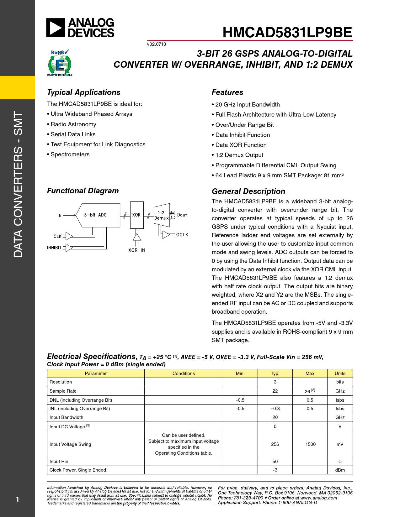 HMCAD5831LP9BE. 3-BIT 26 GSPS ANALOG-TO-DIGITAL. CONVERTER W/ OVERRANGE, INHIBIT, AND 1:2 DEMUX. Typical Applications. Features