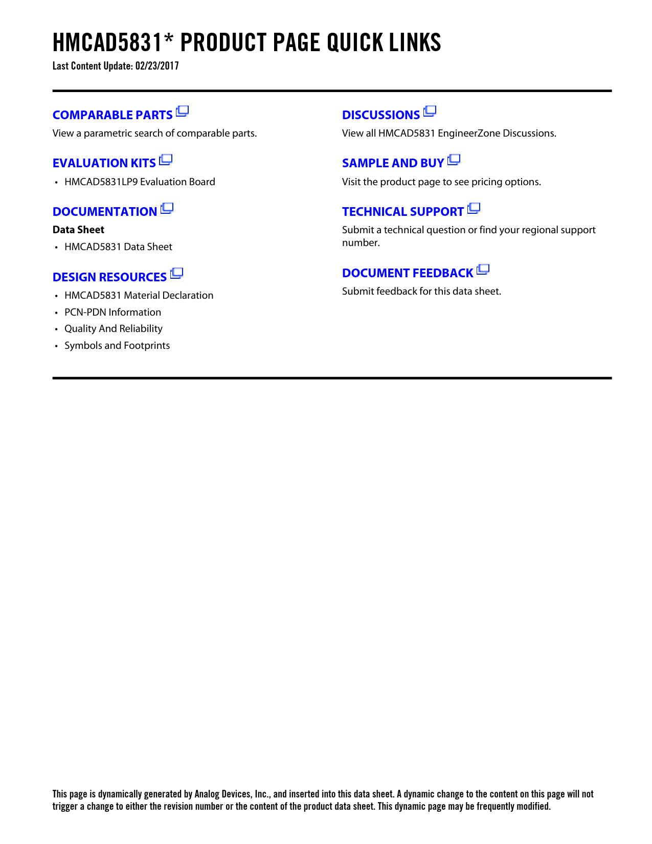 • HMCAD5831 Material Declaration Submit feedback for this data sheet. • PCN-PDN Information • Quality And Reliability • Symbols and Footprints