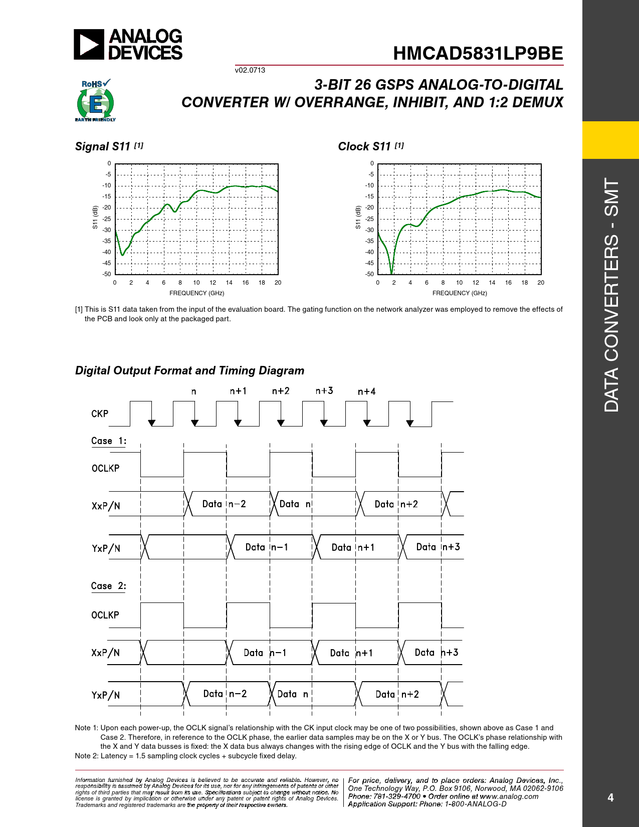 HMCAD5831LP9BE 3-BIT 26 GSPS ANALOG-TO-DIGITAL CONVERTER W/ OVERRANGE, INHIBIT, AND 1:2 DEMUX Clock S11 [1] Signal S11 [1]