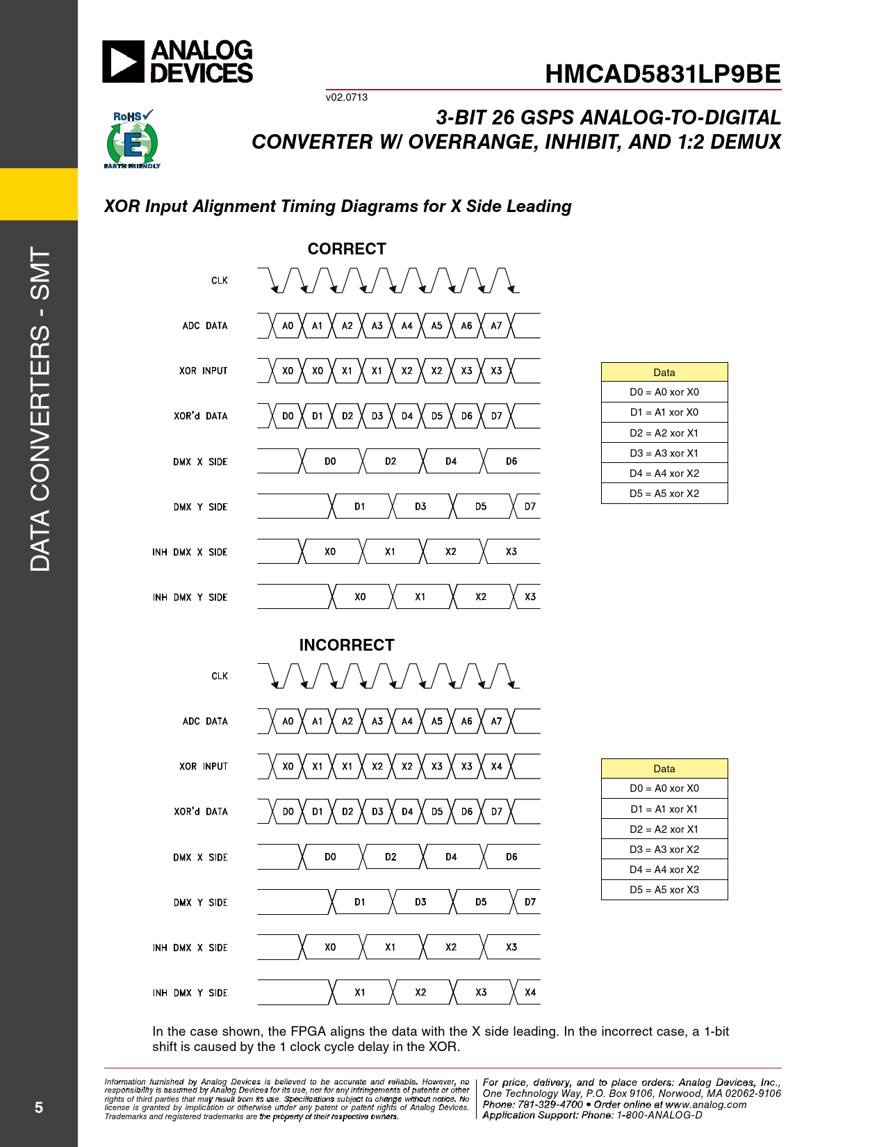Data D0 = a0 xor X0 D1 = a1 xor X1 D2 = a2 xor X1 D3 = a3 xor X2 D4 = a4 xor X2 D5 = a5 xor X3 In the case shown, the FPGa aligns the data with the X side leading. In the incorrect case, a 1-bit shift is caused by the 1 clock cycle delay in the Xor. Inf F or o m r p atio r n ifc ur e n , d ishe e d lbiv y e A r n y a alog n D d t evic o p es is la beclie o eved rd to ebre sa: H ccur iattti e tae M nd re ilicarbloew . H a o ve C wever, o n rp o For price, delivery, and to place orders: Analog Devices, Inc., responsibility is assumed by Analog Devices for its use, nor for any infringements of patents or other oration, 2 Elizabeth Drive, Chelmsford, MA 01824 One Technology Way, P.O. Box 9106, Norwood, MA 02062-9106 Phone: 978-250-3343 Fax: 978-250-3373 O rights of third parties that may result from its use. Specifications subject to change without notice. No P rd hone e r O : 7 n 81- -3li 2n 9 e a -47 t w 0 w 0 • O w rd .h e it r o t niltie n .c e ao t m