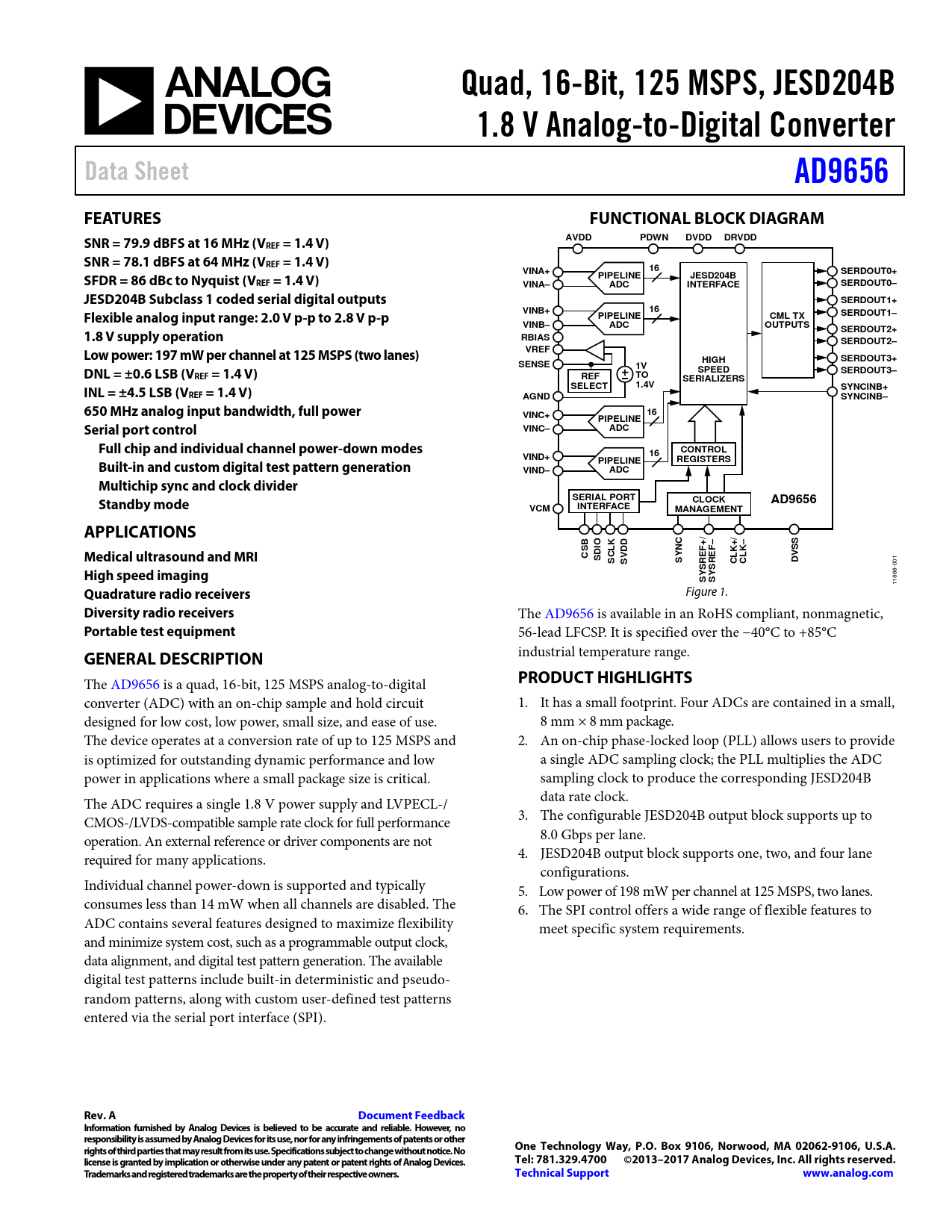 Quad, 16-Bit, 125 MSPS, JESD204B. 1.8 V Analog-to-Digital Converter. Data Sheet. AD9656. FEATURES. FUNCTIONAL BLOCK DIAGRAM