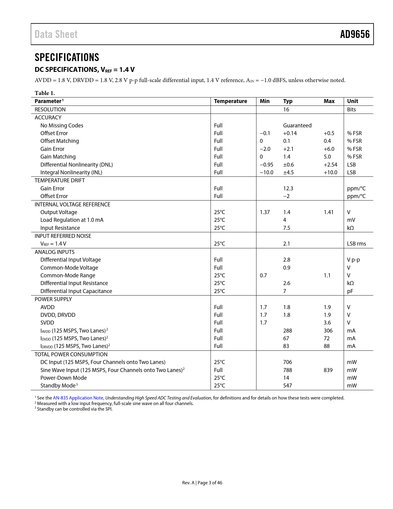 Data Sheet AD9656 SPECIFICATIONS DC SPECIFICATIONS, VREF = 1.4 V