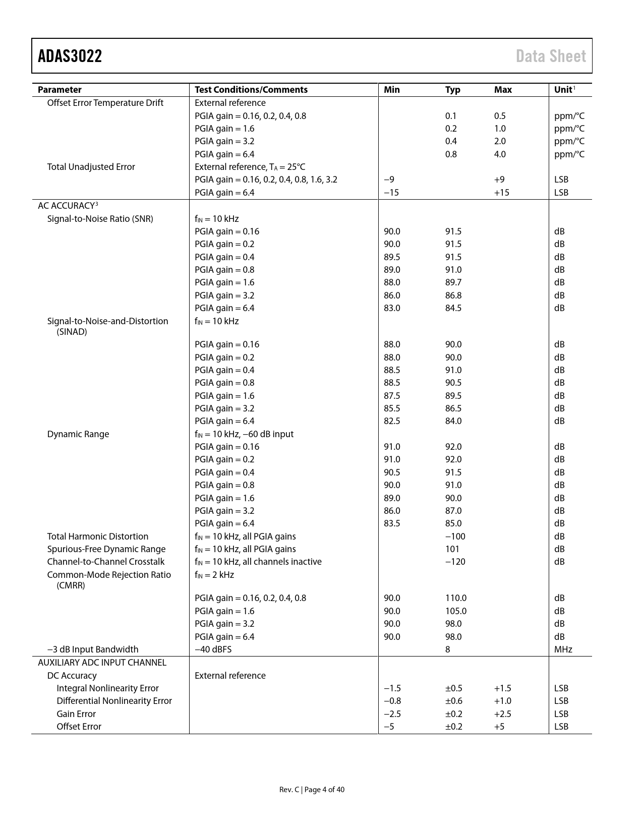 页数 / 页41 / 5 — ADAS3022. Data Sheet. Parameter. Test Conditions/Comments. Min. Typ. Max. …