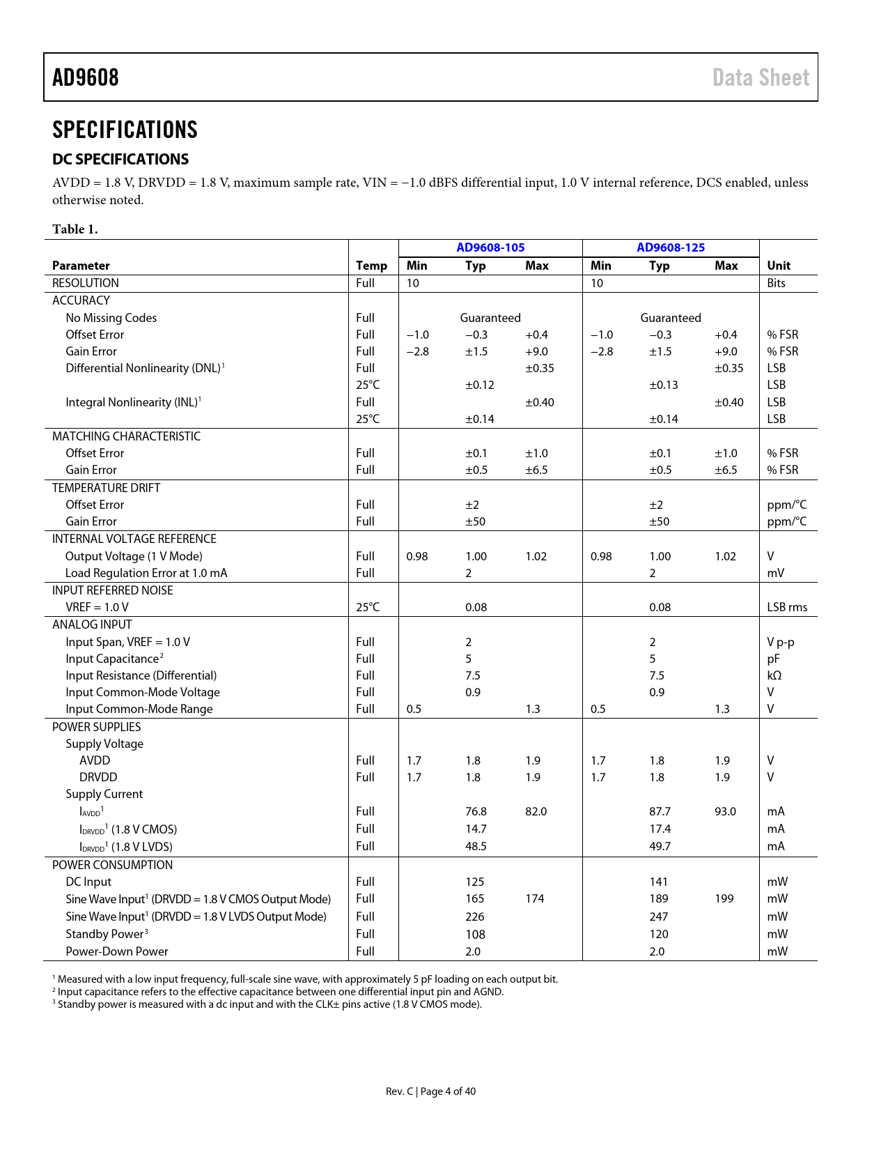 AD9608 Data Sheet SPECIFICATIONS DC SPECIFICATIONS Table 1 AD9608-105 AD9608-125 Parameter Temp Min Typ Max Unit