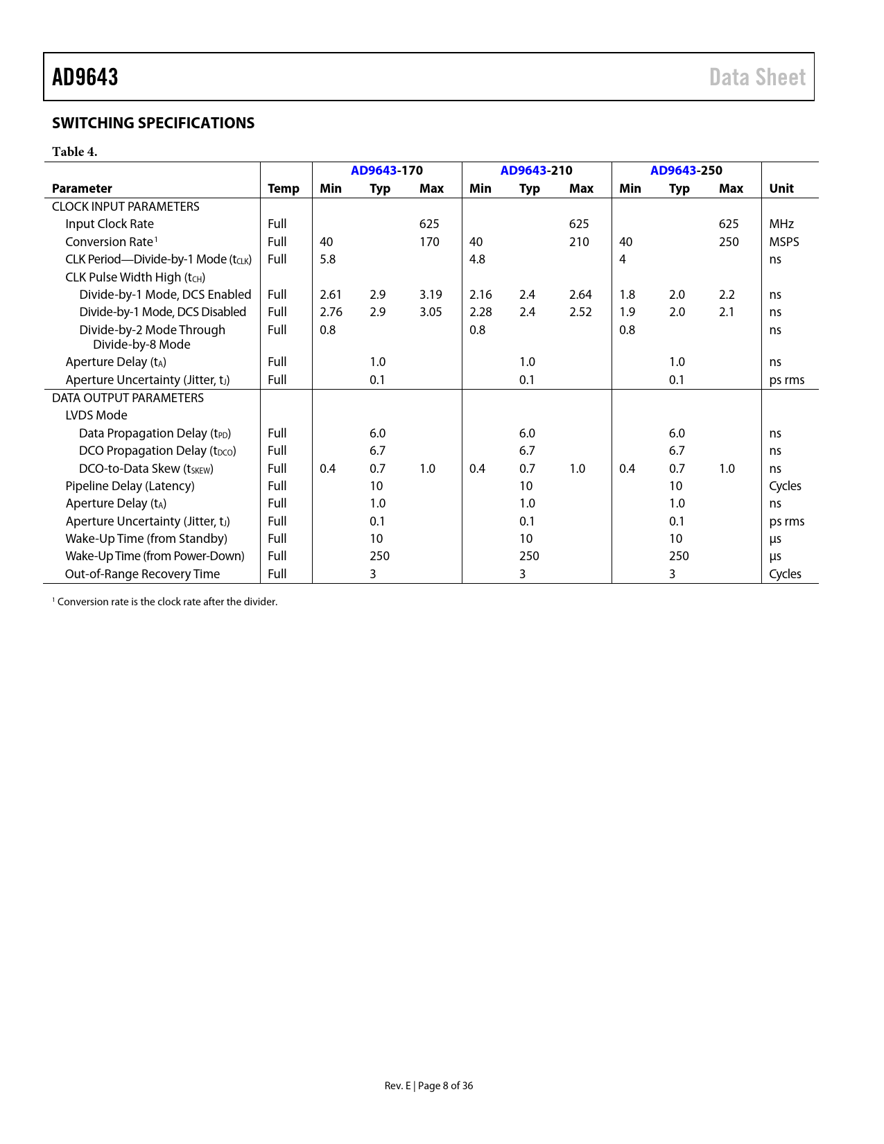 AD9643. Data Sheet. SWITCHING SPECIFICATIONS. Table 4. AD9643-. 170. 210. 250. Parameter. Temp. Min. Typ. Max. Unit