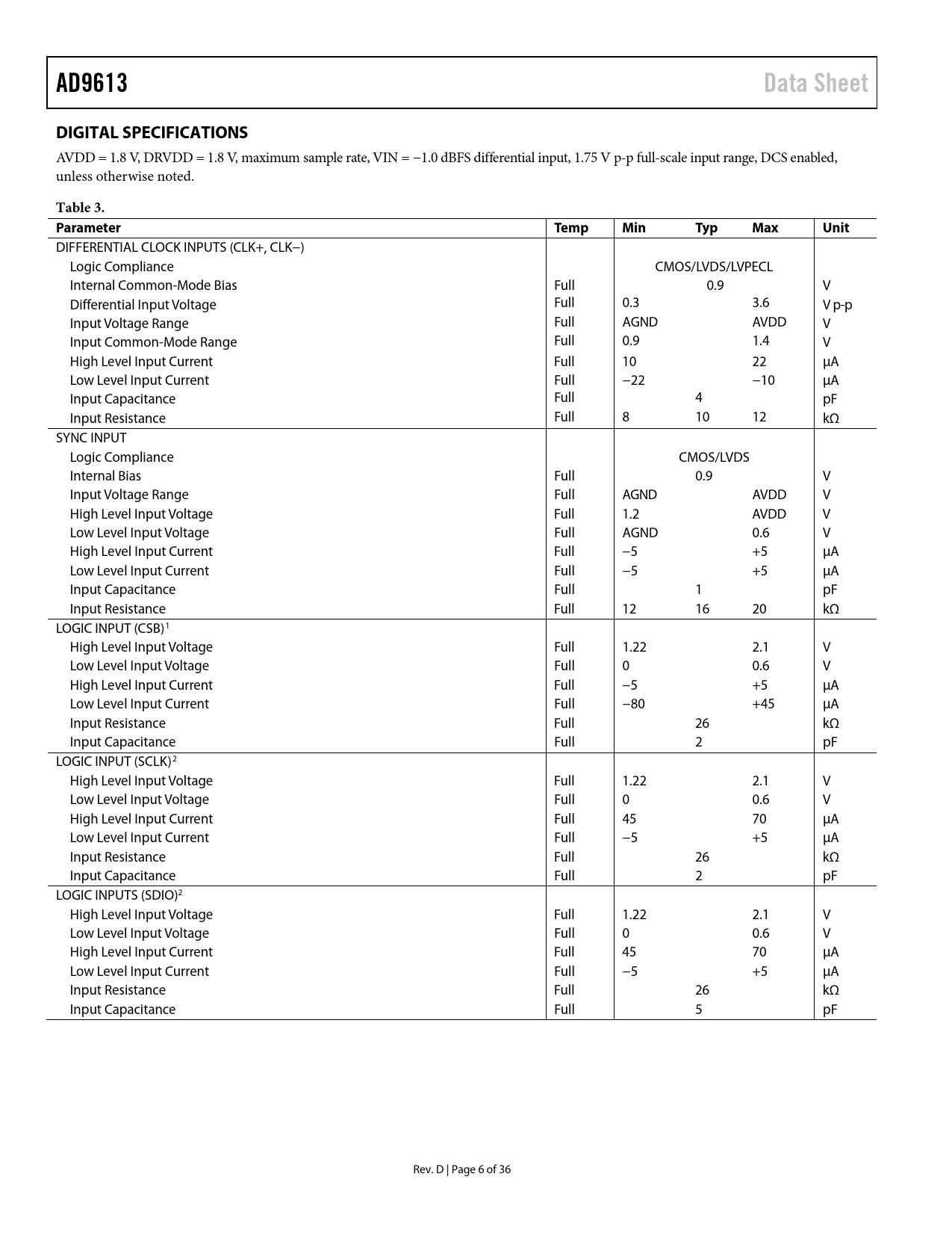 AD9613. Data Sheet. DIGITAL SPECIFICATIONS. Table 3. Parameter. Temp. Min. Typ. Max. Unit