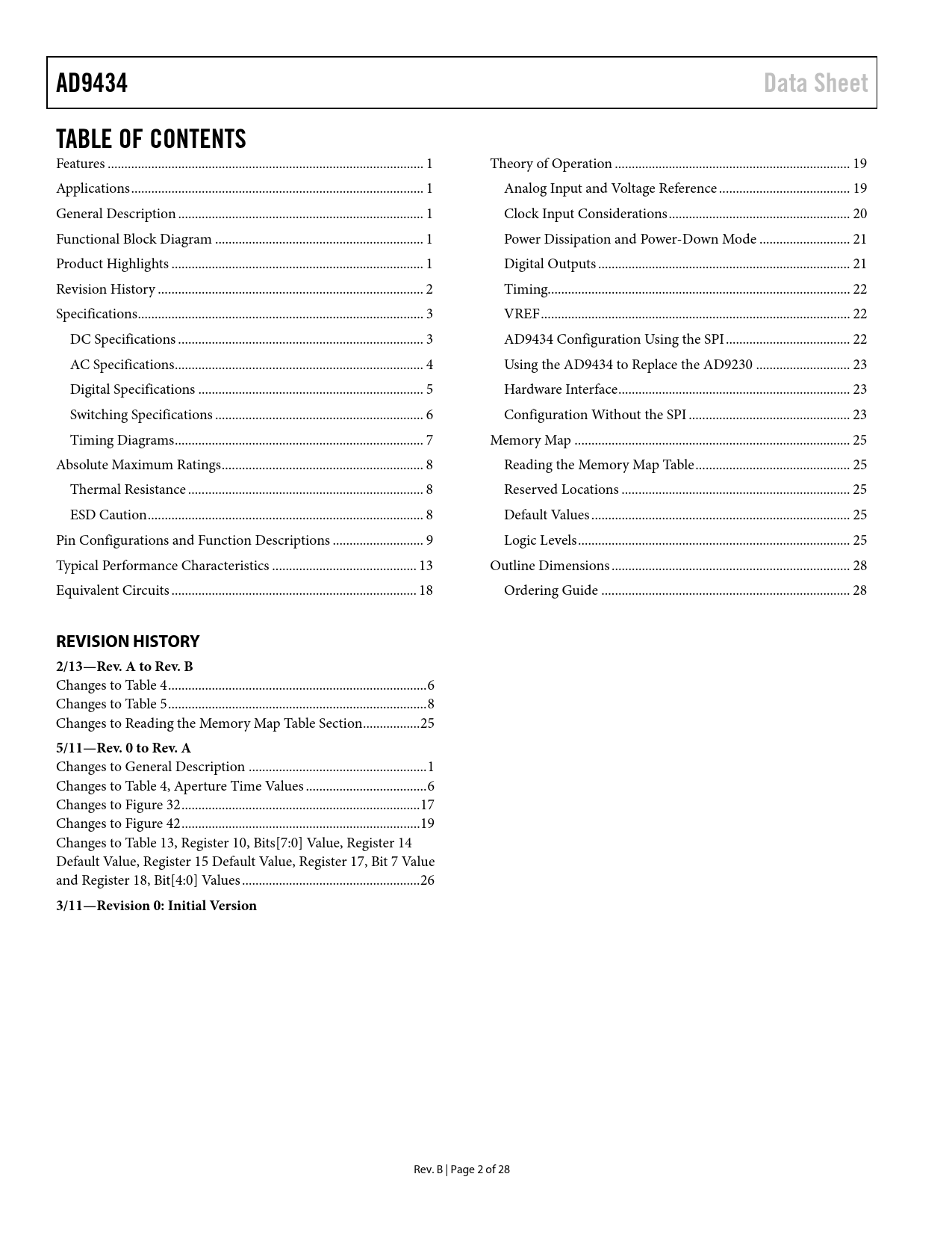 link to page 1 link to page 1 link to page 1 link to page 1 link to page 1 link to page 3 link to page 4 link to page 4 link to page 5 link to page 6 link to page 7 link to page 8 link to page 9 link to page 9 link to page 9 link to page 10 link to page 14 link to page 19 link to page 20 link to page 20 link to page 21 link to page 22 link to page 22 link to page 23 link to page 23 link to page 23 link to page 24 link to page 24 link to page 24 link to page 26 link to page 26 link to page 26 link to page 26 link to page 26 link to page 29 link to page 29 AD9434Data SheetTABLE OF CONTENTS Features .. 1 Theory of Operation .. 19 Applications ... 1 Analog Input and Voltage Reference ... 19 General Description ... 1 Clock Input Considerations .. 20 Functional Block Diagram .. 1 Power Dissipation and Power-Down Mode ... 21 Product Highlights ... 1 Digital Outputs ... 21 Revision History ... 2 Timing.. 22 Specifications ... 3 VREF .. 22 DC Specifications ... 3 AD9434 Configuration Using the SPI ... 22 AC Specifications .. 4 Using the AD9434 to Replace the AD9230 .. 23 Digital Specifications ... 5 Hardware Interface ... 23 Switching Specifications .. 6 Configuration Without the SPI .. 23 Timing Diagrams .. 7 Memory Map .. 25 Absolute Maximum Ratings .. 8 Reading the Memory Map Table .. 25 Thermal Resistance .. 8 Reserved Locations .. 25 ESD Caution .. 8 Default Values ... 25 Pin Configurations and Function Descriptions ... 9 Logic Levels ... 25 Typical Performance Characteristics ... 13 Outline Dimensions ... 28 Equivalent Circuits ... 18 Ordering Guide .. 28 REVISION HISTORY 2/13—Rev. A to Rev. B Changes to Table 4 ... 6 Changes to Table 5 ... 8 Changes to Reading the Memory Map Table Section ... 25 5/11—Rev. 0 to Rev. A Changes to General Description ... 1 Changes to Table 4, Aperture Time Values .. 6 Changes to Figure 32 ... 17 Changes to Figure 42 ... 19 Changes to Table 13, Register 10, Bits[7:0] Value, Register 14 Default Value, Register 15 Default Value, Register 17, Bit 7 Value and Register 18, Bit[4:0] Values ... 26 3/11—Revision 0: Initial Version Rev. B | Page 2 of 28 Document Outline Features Applications General Description Functional Block Diagram Product Highlights Revision History Specifications DC Specifications AC Specifications Digital Specifications Switching Specifications Timing Diagrams Absolute Maximum Ratings Thermal Resistance ESD Caution Pin Configurations and Function Descriptions Typical Performance Characteristics Equivalent Circuits Theory of Operation Analog Input and Voltage Reference Differential Input Configurations Clock Input Considerations Clock Duty Cycle Considerations Clock Jitter Considerations Power Dissipation and Power-Down Mode Digital Outputs Digital Outputs and Timing Output Data Rate and Pinout Configuration Out-of-Range (OR) Timing VREF AD9434 Configuration Using the SPI Using the AD9434 to Replace the AD9230 Hardware Interface Configuration Without the SPI Memory Map Reading the Memory Map Table Reserved Locations Default Values Logic Levels Outline Dimensions Ordering Guide