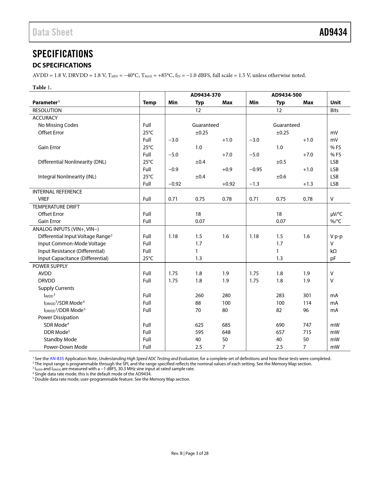 link to page 4 link to page 4 link to page 4 link to page 4 link to page 26 link to page 26 link to page 5 link to page 4 link to page 4 link to page 4 link to page 4 Data SheetAD9434SPECIFICATIONS DC SPECIFICATIONS AVDD = 1.8 V, DRVDD = 1.8 V, TMIN = −40°C, TMAX = +85°C, fIN = −1.0 dBFS, full scale = 1.5 V, unless otherwise noted. Table 1 .AD9434-370AD9434-500Parameter1TempMinTypMaxMinTypMaxUnit RESOLUTION 12 12 Bits ACCURACY No Missing Codes Full Guaranteed Guaranteed Offset Error 25°C ±0.25 ±0.25 mV Full −3.0 +1.0 −3.0 +1.0 mV Gain Error 25°C 1.0 1.0 % FS Full −5.0 +7.0 −5.0 +7.0 % FS Differential Nonlinearity (DNL) 25°C ±0.4 ±0.5 LSB Full −0.9 +0.9 −0.95 +1.0 LSB Integral Nonlinearity (INL) 25°C ±0.4 ±0.6 LSB Full −0.92 +0.92 −1.3 +1.3 LSB INTERNAL REFERENCE VREF Full 0.71 0.75 0.78 0.71 0.75 0.78 V TEMPERATURE DRIFT Offset Error Full 18 18 µV/°C Gain Error Full 0.07 0.07 %/°C ANALOG INPUTS (VIN+, VIN−) Differential Input Voltage Range2 Full 1.18 1.5 1.6 1.18 1.5 1.6 V p-p Input Common-Mode Voltage Full 1.7 1.7 V Input Resistance (Differential) Full 1 1 kΩ Input Capacitance (Differential) 25°C 1.3 1.3 pF POWER SUPPLY AVDD Full 1.75 1.8 1.9 1.75 1.8 1.9 V DRVDD Full 1.75 1.8 1.9 1.75 1.8 1.9 V Supply Currents I 3 AVDD Full 260 280 283 301 mA I 3 DRVDD /SDR Mode4 Full 88 100 100 114 mA I 3 DRVDD /DDR Mode5 Full 70 80 82 96 mA Power Dissipation SDR Mode4 Full 625 685 690 747 mW DDR Mode5 Full 595 648 657 715 mW Standby Mode Full 40 50 40 50 mW Power-Down Mode Full 2.5 7 2.5 7 mW 1 See the AN-835 Application Note, Understanding High Speed ADC Testing and Evaluation, for a complete set of definitions and how these tests were completed. 2 The input range is programmable through the SPI, and the range specified reflects the nominal values of each setting. See the Memory Map section. 3 IAVDD and IDRVDD are measured with a −1 dBFS, 30.3 MHz sine input at rated sample rate. 4 Single data rate mode; this is the default mode of the AD9434. 5 Double data rate mode; user-programmable feature. See the Memory Map section. Rev. B | Page 3 of 28 Document Outline Features Applications General Description Functional Block Diagram Product Highlights Revision History Specifications DC Specifications AC Specifications Digital Specifications Switching Specifications Timing Diagrams Absolute Maximum Ratings Thermal Resistance ESD Caution Pin Configurations and Function Descriptions Typical Performance Characteristics Equivalent Circuits Theory of Operation Analog Input and Voltage Reference Differential Input Configurations Clock Input Considerations Clock Duty Cycle Considerations Clock Jitter Considerations Power Dissipation and Power-Down Mode Digital Outputs Digital Outputs and Timing Output Data Rate and Pinout Configuration Out-of-Range (OR) Timing VREF AD9434 Configuration Using the SPI Using the AD9434 to Replace the AD9230 Hardware Interface Configuration Without the SPI Memory Map Reading the Memory Map Table Reserved Locations Default Values Logic Levels Outline Dimensions Ordering Guide
