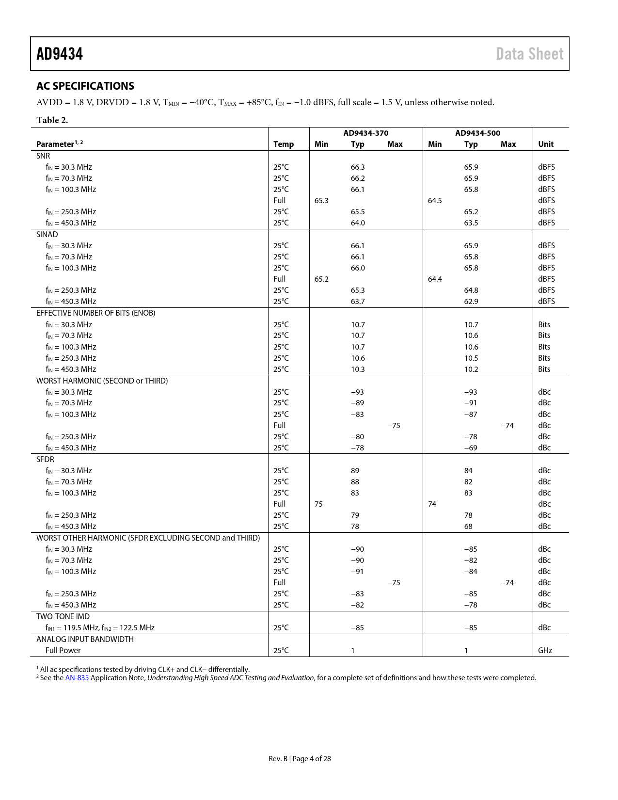 | 页数 / 页 | 29 / 5 — AD9434. Data Sheet. AC SPECIFICATIONS. Table 2. AD9434-370. AD9434-500. … |