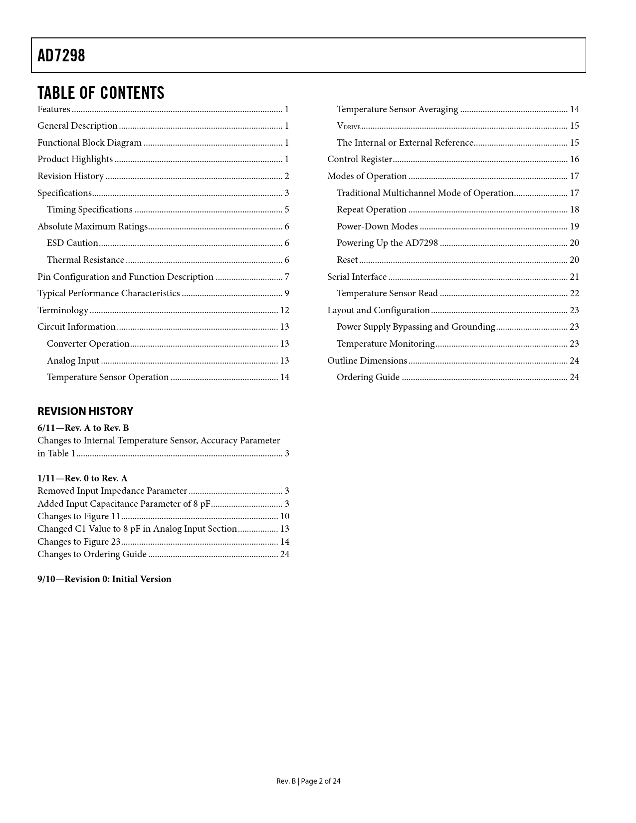 页数 / 页25 / 3 — AD7298. TABLE OF CONTENTS. REVISION HISTORY. 6/11—Rev. A to Rev. B. …