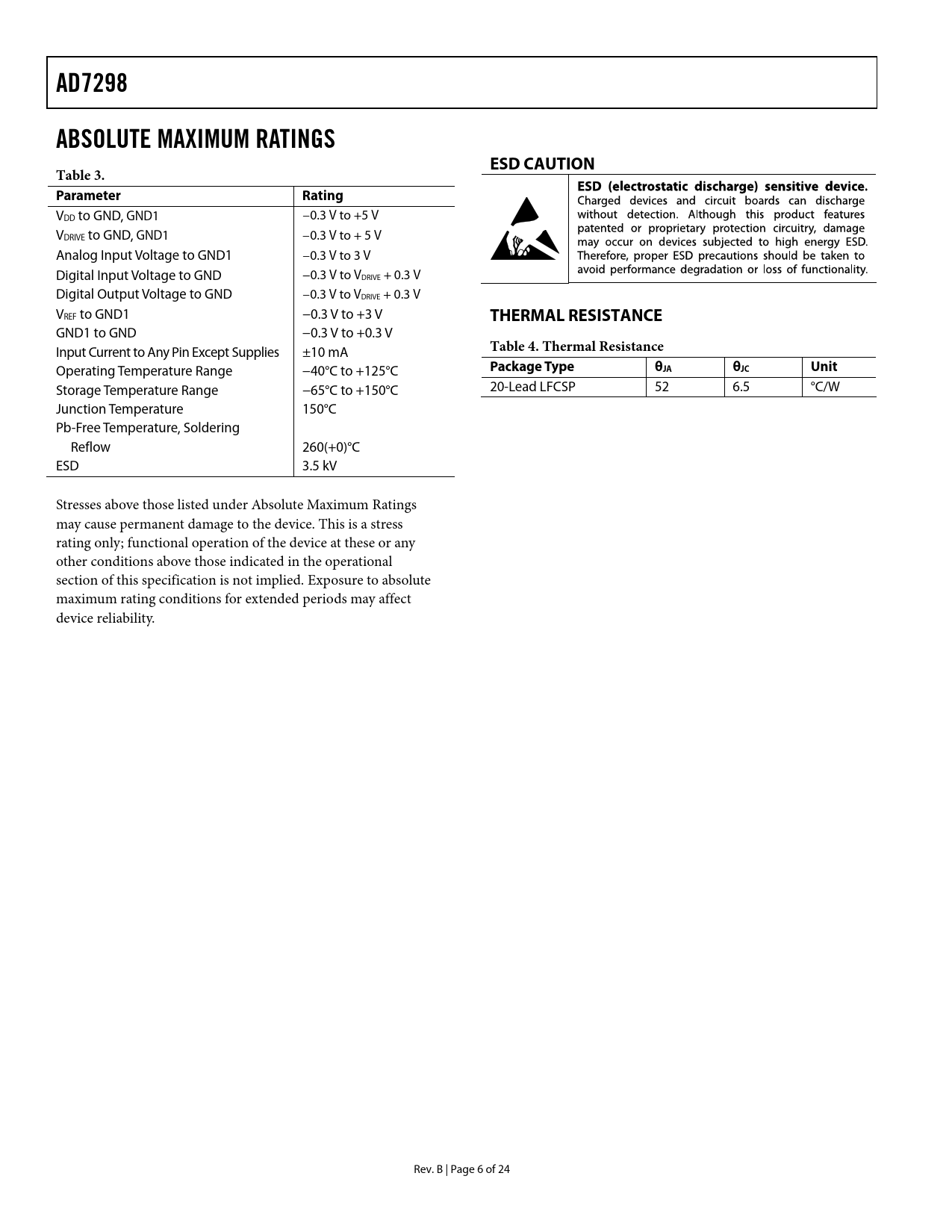 AD7298ABSOLUTE MAXIMUM RATINGSESD CAUTIONTable 3. Parameter Rating VDD to GND, GND1 −0.3 V to +5 V VDRIVE to GND, GND1 −0.3 V to + 5 V Analog Input Voltage to GND1 −0.3 V to 3 V Digital Input Voltage to GND −0.3 V to V DRIVE + 0.3 V Digital Output Voltage to GND −0.3 V to V DRIVE + 0.3 V VREF to GND1 −0.3 V to +3 V THERMAL RESISTANCE GND1 to GND −0.3 V to +0.3 V Input Current to Any Pin Except Supplies ±10 mA Table 4. Thermal Resistance Operating Temperature Range −40°C to +125°C Package TypeθJAθJC Unit Storage Temperature Range −65°C to +150°C 20-Lead LFCSP 52 6.5 °C/W Junction Temperature 150°C Pb-Free Temperature, Soldering Reflow 260(+0)°C ESD 3.5 kV Stresses above those listed under Absolute Maximum Ratings may cause permanent damage to the device. This is a stress rating only; functional operation of the device at these or any other conditions above those indicated in the operational section of this specification is not implied. Exposure to absolute maximum rating conditions for extended periods may affect device reliability. Rev. B | Page 6 of 24 Document Outline FEATURES GENERAL DESCRIPTION FUNCTIONAL BLOCK DIAGRAM PRODUCT HIGHLIGHTS TABLE OF CONTENTS REVISION HISTORY SPECIFICATIONS TIMING SPECIFICATIONS ABSOLUTE MAXIMUM RATINGS ESD CAUTION THERMAL RESISTANCE PIN CONFIGURATION AND FUNCTION DESCRIPTION TYPICAL PERFORMANCE CHARACTERISTICS TERMINOLOGY CIRCUIT INFORMATION CONVERTER OPERATION ANALOG INPUT ADC Transfer Function TEMPERATURE SENSOR OPERATION TEMPERATURE SENSOR AVERAGING Temperature Value Format VDRIVE THE INTERNAL OR EXTERNAL REFERENCE CONTROL REGISTER MODES OF OPERATION TRADITIONAL MULTICHANNEL MODE OF OPERATION REPEAT OPERATION POWER-DOWN MODES Normal Mode Partial Power-Down Mode Full Power-Down Mode POWERING UP THE AD7298 RESET SERIAL INTERFACE TEMPERATURE SENSOR READ LAYOUT AND CONFIGURATION POWER SUPPLY BYPASSING AND GROUNDING TEMPERATURE MONITORING OUTLINE DIMENSIONS ORDERING GUIDE