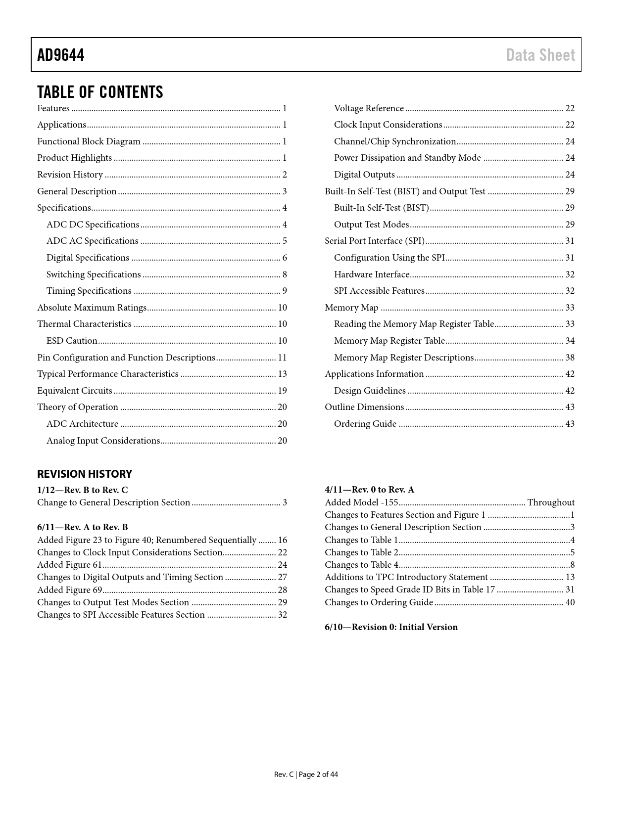 页数 / 页45 / 3 — AD9644. Data Sheet. TABLE OF CONTENTS. REVISION HISTORY 1/12—Rev. B to …
