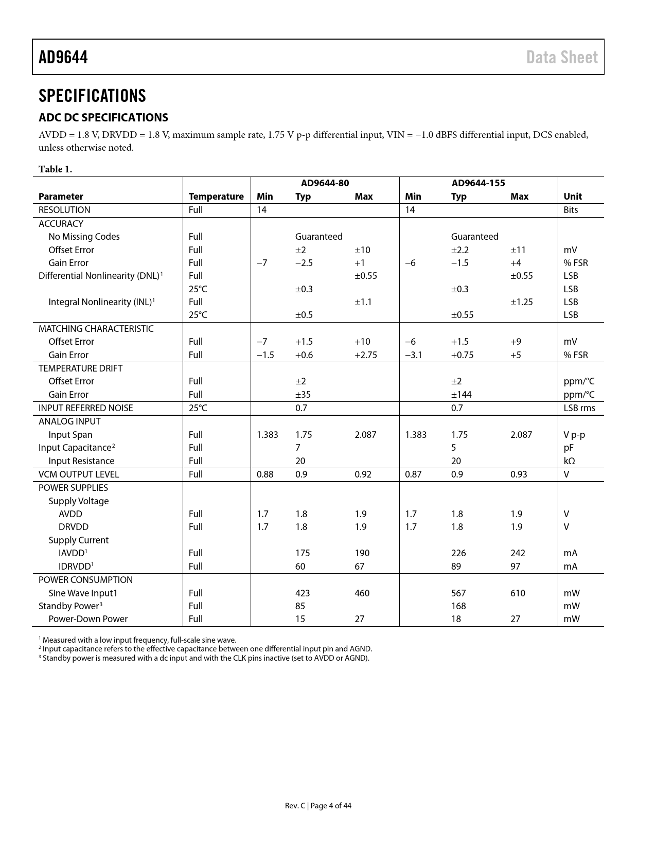 AD9644 Data Sheet SPECIFICATIONS ADC DC SPECIFICATIONS Table 1 AD9644-80 AD9644-155 Parameter Temperature Min Typ Max Min Unit