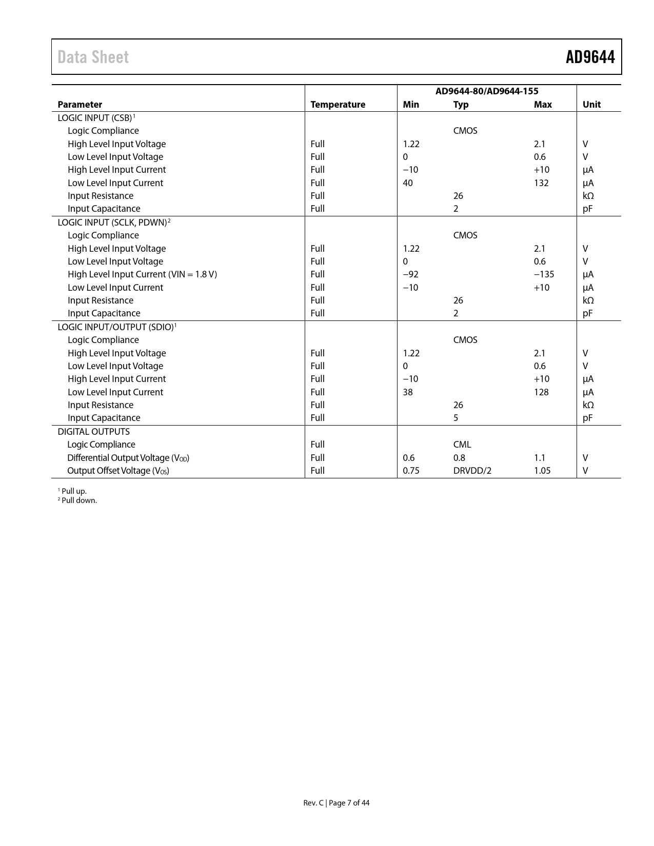 link to page 12 link to page 12 link to page 8 link to page 8 link to page 8 Data SheetAD9644AD9644-80/AD9644-155ParameterTemperatureMinTypMaxUnit LOGIC INPUT (CSB)1 Logic Compliance CMOS High Level Input Voltage Full 1.22 2.1 V Low Level Input Voltage Full 0 0.6 V High Level Input Current Full −10 +10 µA Low Level Input Current Full 40 132 µA Input Resistance Full 26 kΩ Input Capacitance Full 2 pF LOGIC INPUT (SCLK, PDWN)2 Logic Compliance CMOS High Level Input Voltage Full 1.22 2.1 V Low Level Input Voltage Full 0 0.6 V High Level Input Current (VIN = 1.8 V) Full −92 −135 µA Low Level Input Current Full −10 +10 µA Input Resistance Full 26 kΩ Input Capacitance Full 2 pF LOGIC INPUT/OUTPUT (SDIO)1 Logic Compliance CMOS High Level Input Voltage Full 1.22 2.1 V Low Level Input Voltage Full 0 0.6 V High Level Input Current Full −10 +10 µA Low Level Input Current Full 38 128 µA Input Resistance Full 26 kΩ Input Capacitance Full 5 pF DIGITAL OUTPUTS Logic Compliance Full CML Differential Output Voltage (VOD) Full 0.6 0.8 1.1 V Output Offset Voltage (VOS) Full 0.75 DRVDD/2 1.05 V 1 Pull up. 2 Pull down. Rev. C | Page 7 of 44 Document Outline Features Applications Functional Block Diagram Product Highlights Revision History General Description Specifications ADC DC Specifications ADC AC Specifications Digital Specifications Switching Specifications Timing Specifications Timing Diagrams Absolute Maximum Ratings Thermal Characteristics ESD Caution Pin Configuration and Function Descriptions Typical Performance Characteristics Equivalent Circuits Theory of Operation ADC Architecture Analog Input Considerations Input Common Mode Differential Input Configurations Voltage Reference Clock Input Considerations Clock Input Options Input Clock Divider Clock Duty Cycle Jitter Considerations Channel/Chip Synchronization Power Dissipation and Standby Mode Digital Outputs JESD204A Transmit Top Level Description Initial Frame Synchronization Frame and Lane Alignment Monitoring and Correction Digital Outputs and Timing Built-In Self-Test (BIST) and Output Test Built-In Self-Test (BIST) Output Test Modes Serial Port Interface (SPI) Configuration Using the SPI Hardware Interface SPI Accessible Features Memory Map Reading the Memory Map Register Table Open Locations Default Values Logic Levels Transfer Register Map Channel-Specific Registers Memory Map Register Table Memory Map Register Descriptions Sync Control (Register 0x3A) Bits[7:3]—Open Bit 2—Clock Divider Next Sync Only Bit 1—Clock Divider Sync Enable Bit 0—Master Sync Buffer Enable JESD204A Quick Configure (Register 0x5E) Bits[7:3]—Reserved Bits[2:0]—Register Quick Configuration JESD204A Lane Assignment (Register 0x5F) Bits[7:4]—Reserved Bits[3:0]—JESD204A Serial Lane Control JESD204A Link Control Register 1 (Register 0x60) Bit 7—Reserved Bit 6—Serial Tail Bit Enable Bit 5—Serial Test Sample Enable Bit 4—Serial Lane Synchronization Enable Bits[3:2]—Serial Lane Alignment Sequence Mode Bit 1—Frame Alignment Character Insertion Disable Bit 0—Serial Transmit Link Powered Down JESD204A Link Control Register 2 (Register 0x61) Bits[7:6]—Local DSYNC Mode Bit 5—DSYNC Pin Input Inverted Bit 4—CMOS DSYNC Input Bit 3—Open Bit 2—Bypass 8b/10b Encoding Bit 1—Invert Transmit Bits Bit 0—Mirror Serial Output Bits JESD204A Link Control Register 3 (Register 0x62) Bit 7—Disable CHKSUM Bit 6—Open Bits[5:4]—Link Test Generation Input Selection Bit 3—Open Bits[2:0]—Link Test Generation Mode JESD204A Link Control Register 4 (Register 0x63) Bits[7:0]—Initial Lane Alignment Sequence Repeat Count JESD204A Device Identification Number (DID) (Register 0x64) Bits[7:0]—Serial Device Identification (DID) Number JESD204A Bank Identification Number (BID) (Register 0x65) Bits[7:4]—Open Bits[3:0]—Serial Bank Identification (DID) Number JESD204A Lane Identification Number (LID) for Lane 0 (Register 0x66) Bits[7:5]—Open Bits[4:0]—Serial Lane Identification (LID) Number for Lane 0. JESD204A Lane Identification Number (LID) for Lane 1 (Register 0x67) Bits[7:5]—Open Bits[4:0]—Serial Lane Identification (LID) Number for Lane 1. JESD204A Scrambler (SCR) and Lane Configuration Registers (Register 0x6E) Bit 7—Enable Serial Scrambler Mode Bits[6:1]—Open Bit[0]—Serial Lane Control. JESD204A Number of Octets Per Frame (F) (Register 0x6F—Read Only) Bits[7:0]—Number of Octets per Frame (F) JESD204A Number of Frames Per Multiframe (Register 0x70) Bits[7:5]—Reserved Bits[4:0]—Number of Frames per Multiframe (K). JESD204A Number of Converters Per Link (M) (Register 0x71) Bits[7:1]—Reserved Bit 0—Number of Converters per Link per Device (M). JESD204A ADC Resolution (N) and Control Bits Per Sample (CS) (Register 0x72) Bits[7:6]—Number of Control Bits per Sample (CS) Bit 5—Open Bits[4:0]—Converter Resolution (N) JESD204A Total Bits Per Sample (N’) (Register 0x73) Bits[7:5]—Open Bits[4:0]—Total Number of Bits per Sample (N’) JESD204A Samples Per Converter (S) Frame Cycle (Register 0x74) Bits[7:5]—Open Bits[4:0]—Samples per Converter Frame Cycle (S) JESD204A HD and CF Configuration (Register 0x75) Bit 7—Enable High Density Format (Read Only) Bits[6:5]—Reserved Bits[4:0]—Number of Control Words per Frame Clock Cycle per Link (CF) JESD204A Serial Reserved Field 1 (Register 0x76) Bits[7:0]—Serial Reserved Field 1 (RES1) JESD204A Serial Reserved Field 2 (Register 0x77) Bits[7:0]—Serial Reserved Field 2 (RES2) JESD204A Serial Checksum Value for Lane 0 (Register 0x78) Bits[7:0]—Serial Checksum Value for Lane 0 JESD204A Serial Checksum Value for Lane 1 (Register 0x79) Bits[7:0]—Serial Checksum Value for Lane 1 Applications Information Design Guidelines Power and Ground Recommendations Exposed Paddle Thermal Heat Slug Recommendations VCMA and VCMB SPI Port Outline Dimensions Ordering Guide