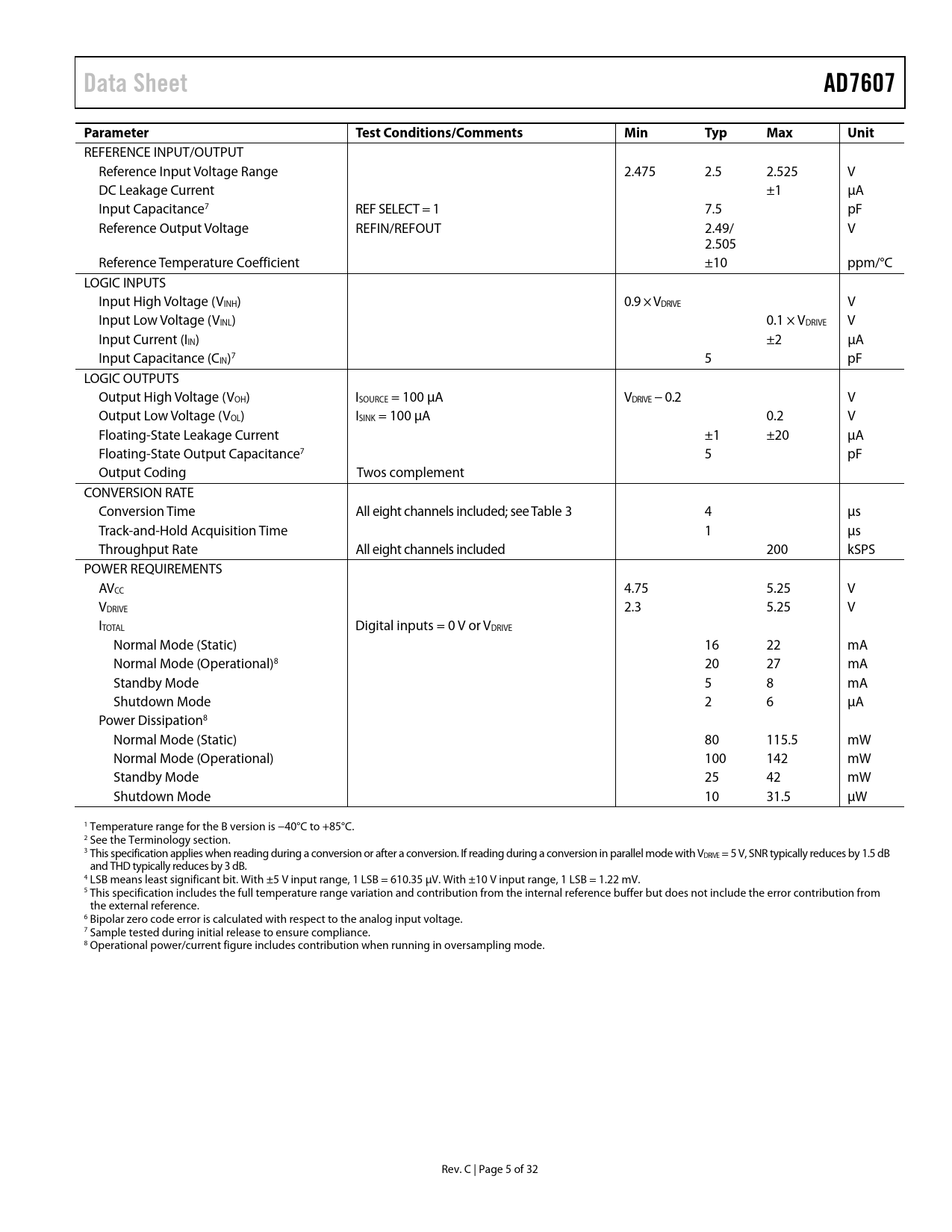 link to page 7 link to page 19 Data SheetAD7607ParameterTest Conditions/CommentsMinTypMaxUnit REFERENCE INPUT/OUTPUT Reference Input Voltage Range 2.475 2.5 2.525 V DC Leakage Current ±1 µA Input Capacitance7 REF SELECT = 1 7.5 pF Reference Output Voltage REFIN/REFOUT 2.49/ V 2.505 Reference Temperature Coefficient ±10 ppm/°C LOGIC INPUTS Input High Voltage (VINH) 0.9 × VDRIVE V Input Low Voltage (VINL) 0.1 × VDRIVE V Input Current (IIN) ±2 µA Input Capacitance (CIN)7 5 pF LOGIC OUTPUTS Output High Voltage (VOH) ISOURCE = 100 µA VDRIVE − 0.2 V Output Low Voltage (VOL) ISINK = 100 µA 0.2 V Floating-State Leakage Current ±1 ±20 µA Floating-State Output Capacitance7 5 pF Output Coding Twos complement CONVERSION RATE Conversion Time Al eight channels included; see Table 3 4 µs Track-and-Hold Acquisition Time 1 µs Throughput Rate Al eight channels included 200 kSPS POWER REQUIREMENTS AVCC 4.75 5.25 V VDRIVE 2.3 5.25 V ITOTAL Digital inputs = 0 V or VDRIVE Normal Mode (Static) 16 22 mA Normal Mode (Operational)8 20 27 mA Standby Mode 5 8 mA Shutdown Mode 2 6 µA Power Dissipation8 Normal Mode (Static) 80 115.5 mW Normal Mode (Operational) 100 142 mW Standby Mode 25 42 mW Shutdown Mode 10 31.5 µW 1 Temperature range for the B version is −40°C to +85°C. 2 See the Terminology section. 3 This specification applies when reading during a conversion or after a conversion. If reading during a conversion in parallel mode with VDRIVE = 5 V, SNR typically reduces by 1.5 dB and THD typical y reduces by 3 dB. 4 LSB means least significant bit. With ±5 V input range, 1 LSB = 610.35 µV. With ±10 V input range, 1 LSB = 1.22 mV. 5 This specification includes the full temperature range variation and contribution from the internal reference buffer but does not include the error contribution from the external reference. 6 Bipolar zero code error is calculated with respect to the analog input voltage. 7 Sample tested during initial release to ensure compliance. 8 Operational power/current figure includes contribution when running in oversampling mode. Rev. C | Page 5 of 32 Document Outline FEATURES APPLICATIONS FUNCTIONAL BLOCK DIAGRAM TABLE OF CONTENTS REVISION HISTORY GENERAL DESCRIPTION SPECIFICATIONS TIMING SPECIFICATIONS Timing Diagrams ABSOLUTE MAXIMUM RATINGS THERMAL RESISTANCE ESD CAUTION PIN CONFIGURATION AND FUNCTION DESCRIPTIONS TYPICAL PERFORMANCE CHARACTERISTICS TERMINOLOGY THEORY OF OPERATION CONVERTER DETAILS ANALOG INPUT Analog Input Ranges Analog Input Impedance Analog Input Clamp Protection Analog Input Antialiasing Filter Track-and-Hold Amplifiers ADC TRANSFER FUNCTION INTERNAL/EXTERNAL REFERENCE External Reference Mode Internal Reference Mode TYPICAL CONNECTION DIAGRAM POWER-DOWN MODES CONVERSION CONTROL Simultaneous Sampling on All Analog Input Channels Simultaneously Sampling Two Sets of Channels DIGITAL INTERFACE PARALLEL INTERFACE (/SER/BYTE SEL = 0) PARALLEL BYTE INTERFACE (/SER/BYTE SEL = 1, DB15 = 1) SERIAL INTERFACE (/SER/BYTE SEL = 1) READING DURING CONVERSION DIGITAL FILTER LAYOUT GUIDELINES OUTLINE DIMENSIONS ORDERING GUIDE NOTES