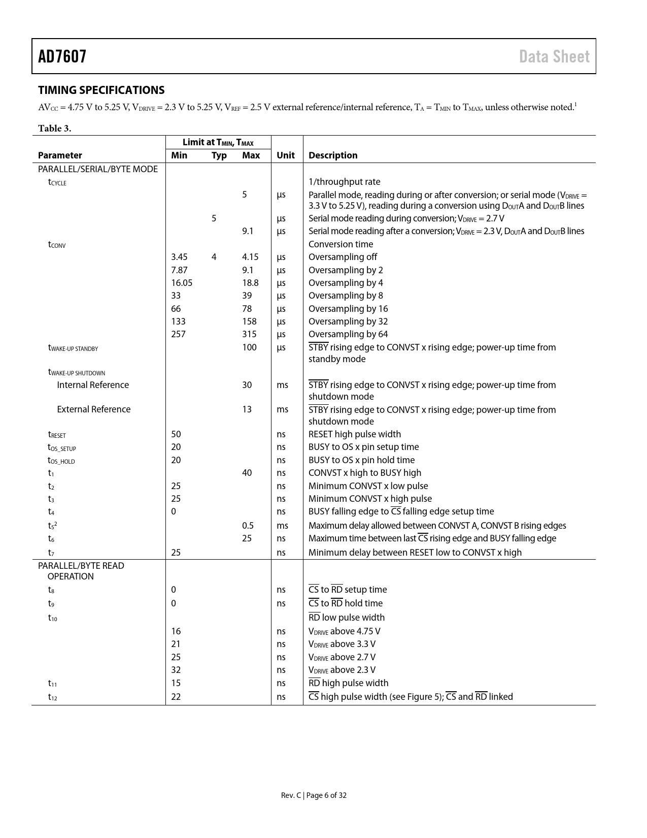 AD7607. Data Sheet. TIMING SPECIFICATIONS. Table 3. Limit at TMIN, TMAX. Parameter. Min. Typ. Max. Unit. Description