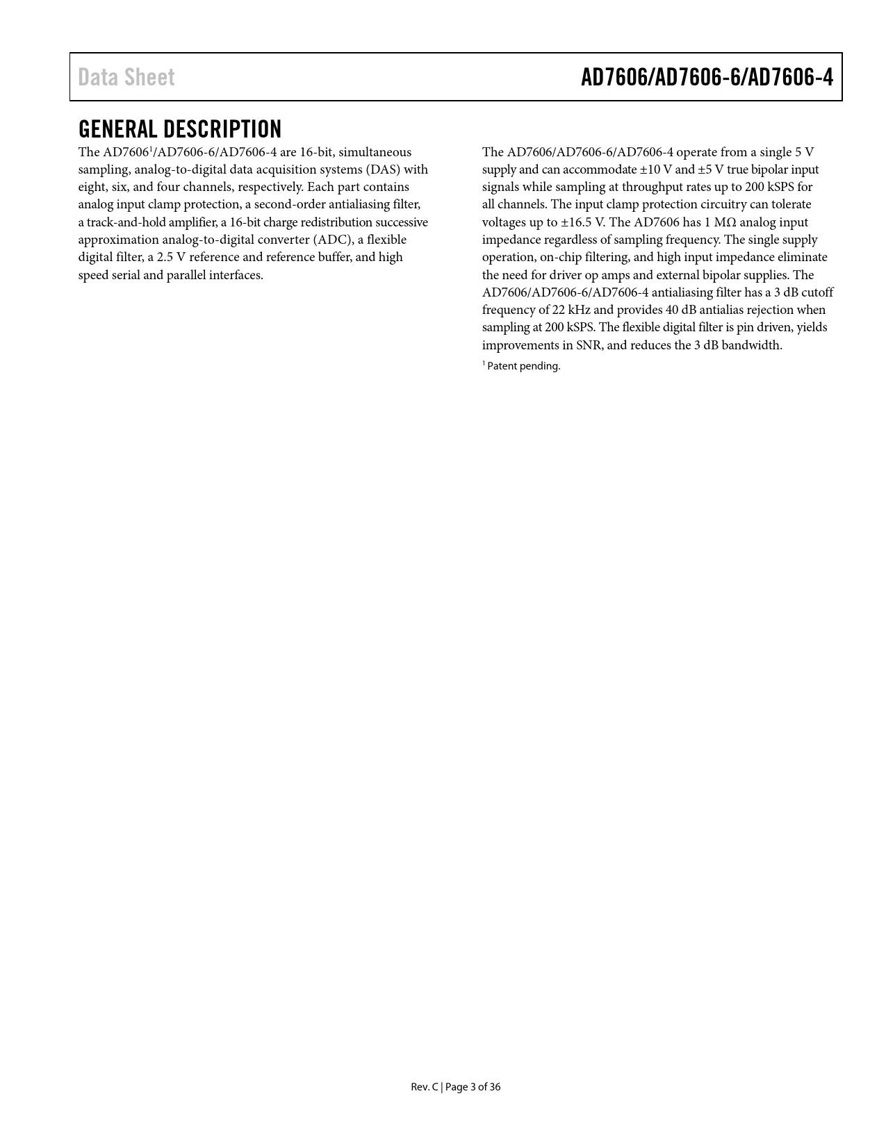 link to page 3 Data SheetAD7606/AD7606-6/AD7606-4GENERAL DESCRIPTION The AD76061/AD7606-6/AD7606-4 are 16-bit, simultaneous The AD7606/AD7606-6/AD7606-4 operate from a single 5 V sampling, analog-to-digital data acquisition systems (DAS) with supply and can accommodate ±10 V and ±5 V true bipolar input eight, six, and four channels, respectively. Each part contains signals while sampling at throughput rates up to 200 kSPS for analog input clamp protection, a second-order antialiasing filter, al channels. The input clamp protection circuitry can tolerate a track-and-hold amplifier, a 16-bit charge redistribution successive voltages up to ±16.5 V. The AD7606 has 1 MΩ analog input approximation analog-to-digital converter (ADC), a flexible impedance regardless of sampling frequency. The single supply digital filter, a 2.5 V reference and reference buffer, and high operation, on-chip filtering, and high input impedance eliminate speed serial and paral el interfaces. the need for driver op amps and external bipolar supplies. The AD7606/AD7606-6/AD7606-4 antialiasing filter has a 3 dB cutoff frequency of 22 kHz and provides 40 dB antialias rejection when sampling at 200 kSPS. The flexible digital filter is pin driven, yields improvements in SNR, and reduces the 3 dB bandwidth. 1 Patent pending. Rev. C | Page 3 of 36 Document Outline Features Applications Functional Block Diagram Revision History General Description Specifications Timing Specifications Timing Diagrams Absolute Maximum Ratings Thermal Resistance ESD Caution Pin Configurations and Function Descriptions Typical Performance Characteristics Terminology Theory of Operation Converter Details Analog Input Analog Input Ranges Analog Input Impedance Analog Input Clamp Protection Analog Input Antialiasing Filter Track-and-Hold Amplifiers ADC Transfer Function Internal/External Reference Typical Connection Diagram Power-Down Modes Conversion Control Simultaneous Sampling on All Analog Input Channels Simultaneously Sampling Two Sets of Channels Digital Interface Parallel Interface (PAR/SER/BYTE SEL = 0) Parallel Byte (PAR/SER/BYTE SEL = 1, DB15 = 1) Serial Interface (PAR/SER/BYTE SEL = 1) Reading During Conversion Digital Filter Layout Guidelines Outline Dimensions Ordering Guide