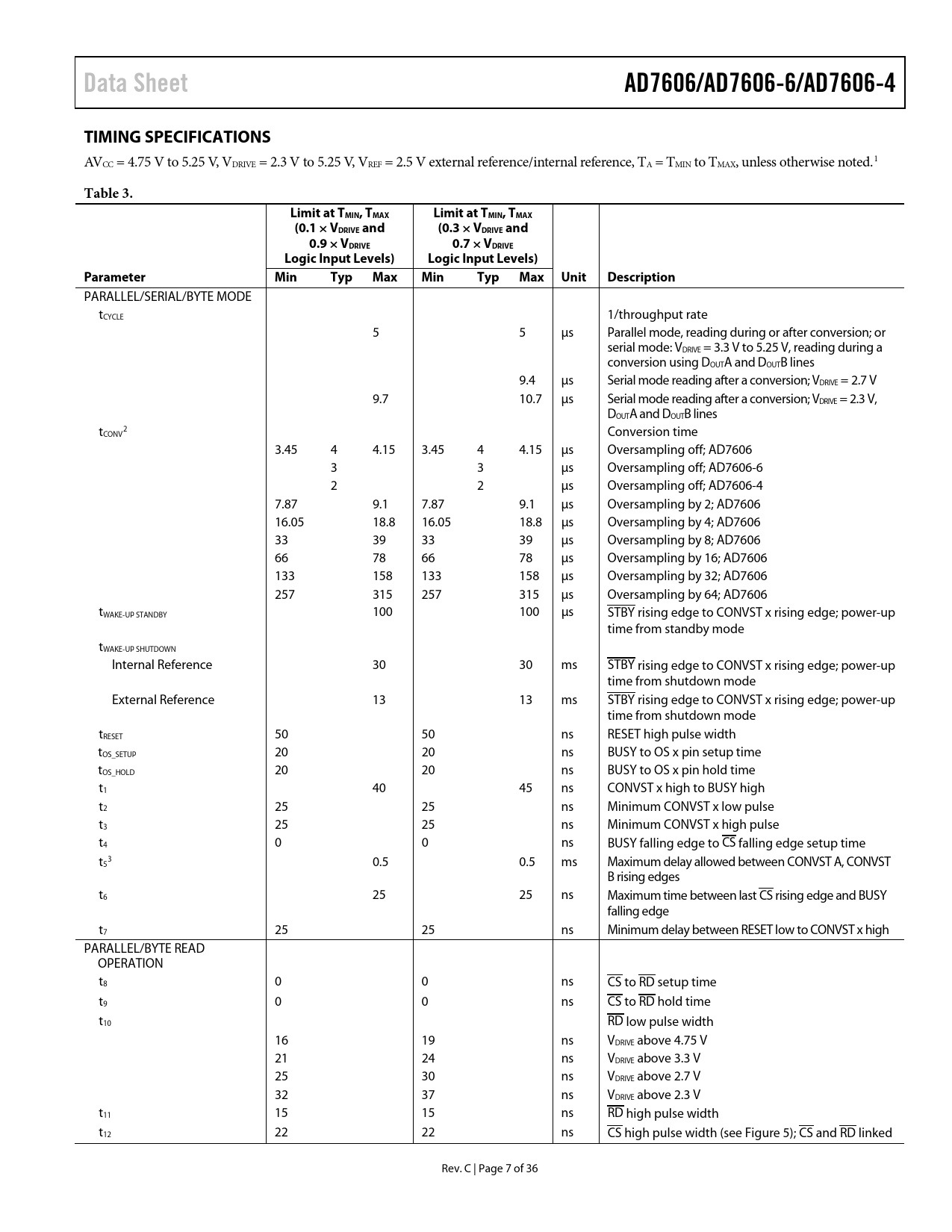 link to page 10 link to page 9 link to page 9 link to page 9 Data SheetAD7606/AD7606-6/AD7606-4TIMING SPECIFICATIONS AVCC = 4.75 V to 5.25 V, VDRIVE = 2.3 V to 5.25 V, VREF = 2.5 V external reference/internal reference, TA = TMIN to TMAX, unless otherwise noted.1 Table 3.Limit at TMIN, TMAXLimit at TMIN, TMAX(0.1 × VDRIVE and(0.3 × VDRIVE and0.9 × VDRIVE0.7 × VDRIVELogic Input Levels)Logic Input Levels)ParameterMinTypMaxMinTypMax UnitDescription PARALLEL/SERIAL/BYTE MODE tCYCLE 1/throughput rate 5 5 µs Parallel mode, reading during or after conversion; or serial mode: VDRIVE = 3.3 V to 5.25 V, reading during a conversion using DOUTA and DOUTB lines 9.4 µs Serial mode reading after a conversion; VDRIVE = 2.7 V 9.7 10.7 µs Serial mode reading after a conversion; VDRIVE = 2.3 V, DOUTA and DOUTB lines t 2 CONV Conversion time 3.45 4 4.15 3.45 4 4.15 µs Oversampling off; AD7606 3 3 µs Oversampling off; AD7606-6 2 2 µs Oversampling off; AD7606-4 7.87 9.1 7.87 9.1 µs Oversampling by 2; AD7606 16.05 18.8 16.05 18.8 µs Oversampling by 4; AD7606 33 39 33 39 µs Oversampling by 8; AD7606 66 78 66 78 µs Oversampling by 16; AD7606 133 158 133 158 µs Oversampling by 32; AD7606 257 315 257 315 µs Oversampling by 64; AD7606 tWAKE-UP STANDBY 100 100 µs STBY rising edge to CONVST x rising edge; power-up time from standby mode tWAKE-UP SHUTDOWN Internal Reference 30 30 ms STBY rising edge to CONVST x rising edge; power-up time from shutdown mode External Reference 13 13 ms STBY rising edge to CONVST x rising edge; power-up time from shutdown mode tRESET 50 50 ns RESET high pulse width tOS_SETUP 20 20 ns BUSY to OS x pin setup time tOS_HOLD 20 20 ns BUSY to OS x pin hold time t1 40 45 ns CONVST x high to BUSY high t2 25 25 ns Minimum CONVST x low pulse t3 25 25 ns Minimum CONVST x high pulse t4 0 0 ns BUSY falling edge to CS falling edge setup time t 3 5 0.5 0.5 ms Maximum delay al owed between CONVST A, CONVST B rising edges t6 25 25 ns Maximum time between last CS rising edge and BUSY fal ing edge t7 25 25 ns Minimum delay between RESET low to CONVST x high PARALLEL/BYTE READ OPERATION t8 0 0 ns CS to RD setup time t9 0 0 ns CS to RD hold time t10 RD low pulse width 16 19 ns VDRIVE above 4.75 V 21 24 ns VDRIVE above 3.3 V 25 30 ns VDRIVE above 2.7 V 32 37 ns VDRIVE above 2.3 V t11 15 15 ns RD high pulse width t12 22 22 ns CS high pulse width (see Figure 5); CS and RD linked Rev. C | Page 7 of 36 Document Outline Features Applications Functional Block Diagram Revision History General Description Specifications Timing Specifications Timing Diagrams Absolute Maximum Ratings Thermal Resistance ESD Caution Pin Configurations and Function Descriptions Typical Performance Characteristics Terminology Theory of Operation Converter Details Analog Input Analog Input Ranges Analog Input Impedance Analog Input Clamp Protection Analog Input Antialiasing Filter Track-and-Hold Amplifiers ADC Transfer Function Internal/External Reference Typical Connection Diagram Power-Down Modes Conversion Control Simultaneous Sampling on All Analog Input Channels Simultaneously Sampling Two Sets of Channels Digital Interface Parallel Interface (PAR/SER/BYTE SEL = 0) Parallel Byte (PAR/SER/BYTE SEL = 1, DB15 = 1) Serial Interface (PAR/SER/BYTE SEL = 1) Reading During Conversion Digital Filter Layout Guidelines Outline Dimensions Ordering Guide
