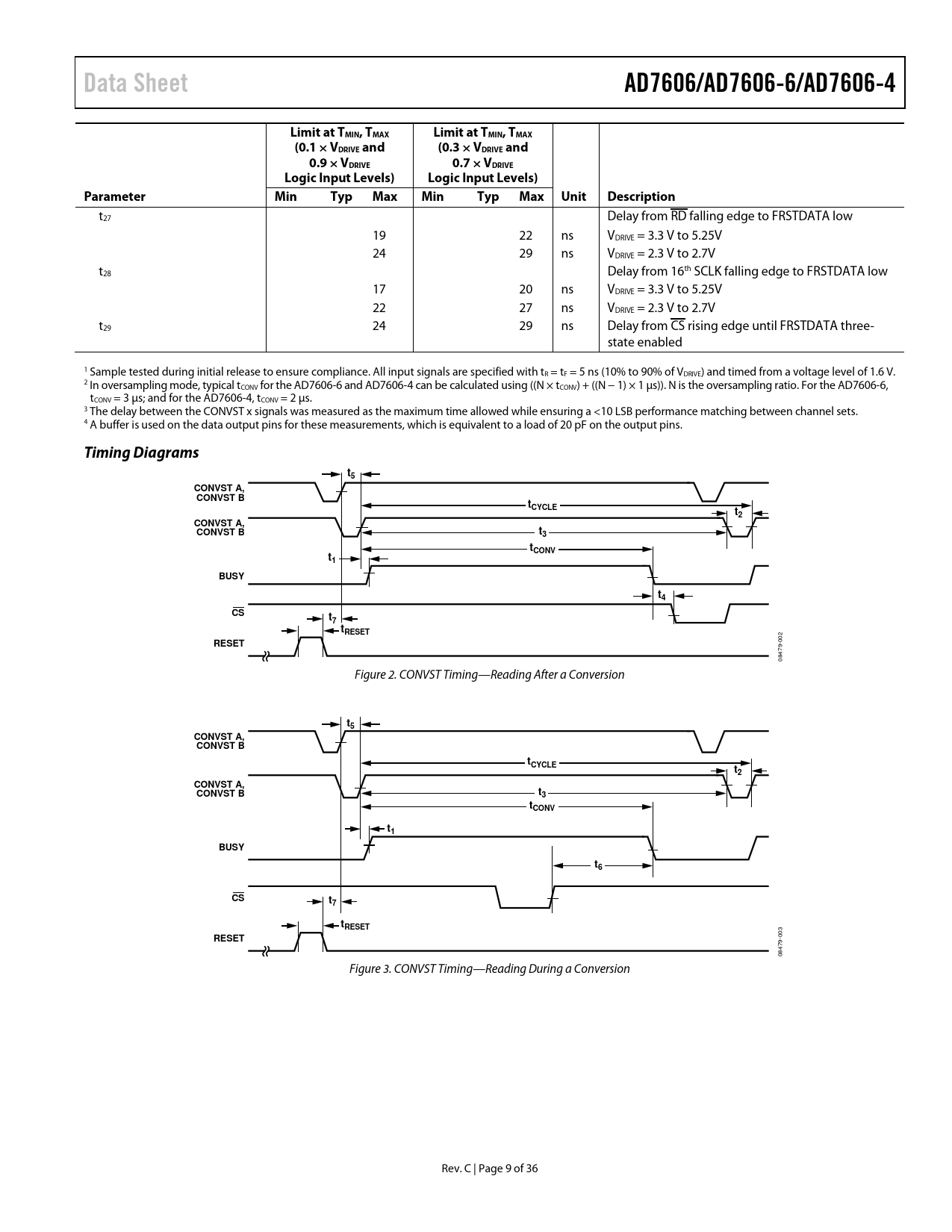 Data SheetAD7606/AD7606-6/AD7606-4Limit at TMIN, TMAXLimit at TMIN, TMAX(0.1 × VDRIVE and(0.3 × VDRIVE and0.9 × VDRIVE0.7 × VDRIVELogic Input Levels)Logic Input Levels)ParameterMinTypMaxMinTypMax UnitDescription t27 Delay from RD falling edge to FRSTDATA low 19 22 ns VDRIVE = 3.3 V to 5.25V 24 29 ns VDRIVE = 2.3 V to 2.7V t28 Delay from 16th SCLK falling edge to FRSTDATA low 17 20 ns VDRIVE = 3.3 V to 5.25V 22 27 ns VDRIVE = 2.3 V to 2.7V t29 24 29 ns Delay from CS rising edge until FRSTDATA three- state enabled 1 Sample tested during initial release to ensure compliance. All input signals are specified with tR = tF = 5 ns (10% to 90% of VDRIVE) and timed from a voltage level of 1.6 V. 2 In oversampling mode, typical tCONV for the AD7606-6 and AD7606-4 can be calculated using ((N × tCONV) + ((N − 1) × 1 µs)). N is the oversampling ratio. For the AD7606-6, tCONV = 3 µs; and for the AD7606-4, tCONV = 2 µs. 3 The delay between the CONVST x signals was measured as the maximum time allowed while ensuring a <10 LSB performance matching between channel sets. 4 A buffer is used on the data output pins for these measurements, which is equivalent to a load of 20 pF on the output pins. Timing Diagramst5CONVST A,CONVST BtCYCLEt2CONVST A,CONVST Bt3tCONVt1BUSYt4CSt7tRESETRESET 002 08479- Figure 2. CONVST Timing—Reading After a Conversion t5CONVST A,CONVST BtCYCLEt2CONVST A,CONVST Bt3tCONVt1BUSYt6CSt7tRESETRESET 003 08479- Figure 3. CONVST Timing—Reading During a Conversion Rev. C | Page 9 of 36 Document Outline Features Applications Functional Block Diagram Revision History General Description Specifications Timing Specifications Timing Diagrams Absolute Maximum Ratings Thermal Resistance ESD Caution Pin Configurations and Function Descriptions Typical Performance Characteristics Terminology Theory of Operation Converter Details Analog Input Analog Input Ranges Analog Input Impedance Analog Input Clamp Protection Analog Input Antialiasing Filter Track-and-Hold Amplifiers ADC Transfer Function Internal/External Reference Typical Connection Diagram Power-Down Modes Conversion Control Simultaneous Sampling on All Analog Input Channels Simultaneously Sampling Two Sets of Channels Digital Interface Parallel Interface (PAR/SER/BYTE SEL = 0) Parallel Byte (PAR/SER/BYTE SEL = 1, DB15 = 1) Serial Interface (PAR/SER/BYTE SEL = 1) Reading During Conversion Digital Filter Layout Guidelines Outline Dimensions Ordering Guide