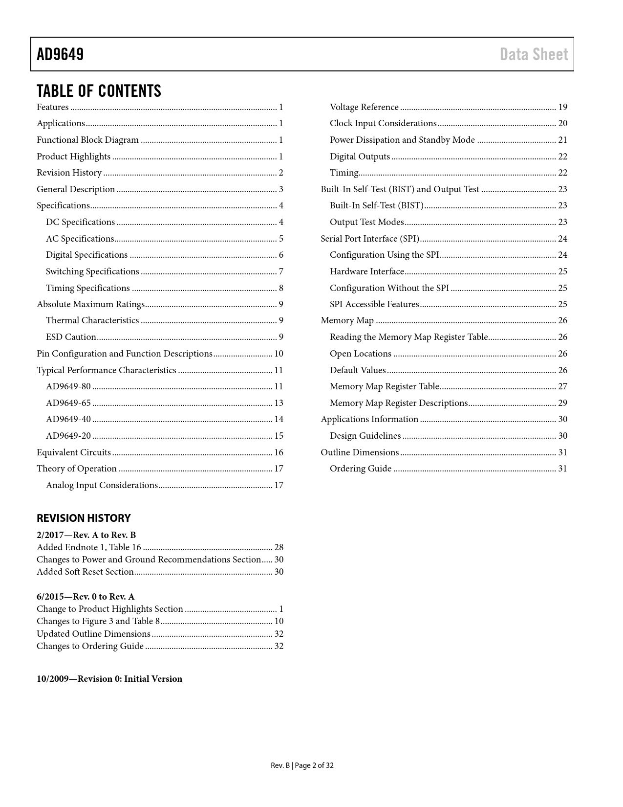 link to page 1 link to page 1 link to page 1 link to page 1 link to page 3 link to page 4 link to page 5 link to page 5 link to page 6 link to page 7 link to page 8 link to page 9 link to page 10 link to page 10 link to page 10 link to page 11 link to page 12 link to page 12 link to page 14 link to page 15 link to page 16 link to page 17 link to page 18 link to page 18 link to page 20 link to page 21 link to page 22 link to page 23 link to page 23 link to page 24 link to page 24 link to page 24 link to page 25 link to page 25 link to page 26 link to page 26 link to page 26 link to page 27 link to page 27 link to page 27 link to page 27 link to page 28 link to page 30 link to page 31 link to page 31 link to page 32 link to page 32 AD9649Data SheetTABLE OF CONTENTS Features .. 1 Voltage Reference ... 19 Applications ... 1 Clock Input Considerations .. 20 Functional Block Diagram .. 1 Power Dissipation and Standby Mode .. 21 Product Highlights ... 1 Digital Outputs ... 22 Revision History ... 2 Timing.. 22 General Description ... 3 Built-In Self-Test (BIST) and Output Test .. 23 Specifications ... 4 Built-In Self-Test (BIST) .. 23 DC Specifications ... 4 Output Test Modes ... 23 AC Specifications .. 5 Serial Port Interface (SPI) .. 24 Digital Specifications ... 6 Configuration Using the SPI ... 24 Switching Specifications .. 7 Hardware Interface ... 25 Timing Specifications .. 8 Configuration Without the SPI .. 25 Absolute Maximum Ratings .. 9 SPI Accessible Features .. 25 Thermal Characteristics .. 9 Memory Map .. 26 ESD Caution .. 9 Reading the Memory Map Register Table ... 26 Pin Configuration and Function Descriptions ... 10 Open Locations .. 26 Typical Performance Characteristics ... 11 Default Values ... 26 AD9649-80 .. 11 Memory Map Register Table ... 27 AD9649-65 .. 13 Memory Map Register Descriptions .. 29 AD9649-40 .. 14 Applications Information .. 30 AD9649-20 .. 15 Design Guidelines .. 30 Equivalent Circuits ... 16 Outline Dimensions ... 31 Theory of Operation .. 17 Ordering Guide .. 31 Analog Input Considerations .. 17 REVISION HISTORY 2/2017—Rev. A to Rev. B Added Endnote 1, Table 16 ... 28 Changes to Power and Ground Recommendations Section ... 30 Added Soft Reset Section ... 30 6/2015—Rev. 0 to Rev. A Change to Product Highlights Section .. 1 Changes to Figure 3 and Table 8 ... 10 Updated Outline Dimensions ... 32 Changes to Ordering Guide .. 32 10/2009—Revision 0: Initial Version Rev. B | Page 2 of 32 Document Outline FEATURES APPLICATIONS FUNCTIONAL BLOCK DIAGRAM PRODUCT HIGHLIGHTS REVISION HISTORY GENERAL DESCRIPTION SPECIFICATIONS DC SPECIFICATIONS AC SPECIFICATIONS DIGITAL SPECIFICATIONS SWITCHING SPECIFICATIONS TIMING SPECIFICATIONS ABSOLUTE MAXIMUM RATINGS THERMAL CHARACTERISTICS ESD CAUTION PIN CONFIGURATION AND FUNCTION DESCRIPTIONS TYPICAL PERFORMANCE CHARACTERISTICS AD9649-80 AD9649-65 AD9649-40 AD9649-20 EQUIVALENT CIRCUITS THEORY OF OPERATION ANALOG INPUT CONSIDERATIONS Input Common Mode Differential Input Configurations Single-Ended Input Configuration VOLTAGE REFERENCE Internal Reference Connection External Reference Operation CLOCK INPUT CONSIDERATIONS Clock Input Options Input Clock Divider Clock Duty Cycle Jitter Considerations POWER DISSIPATION AND STANDBY MODE DIGITAL OUTPUTS Digital Output Enable Function (OEB) TIMING Data Clock Output (DCO) BUILT-IN SELF-TEST (BIST) AND OUTPUT TEST BUILT-IN SELF-TEST (BIST) OUTPUT TEST MODES SERIAL PORT INTERFACE (SPI) CONFIGURATION USING THE SPI HARDWARE INTERFACE CONFIGURATION WITHOUT THE SPI SPI ACCESSIBLE FEATURES MEMORY MAP READING THE MEMORY MAP REGISTER TABLE OPEN LOCATIONS DEFAULT VALUES Logic Levels Transfer Register Map MEMORY MAP REGISTER TABLE MEMORY MAP REGISTER DESCRIPTIONS USR2 (Register 0x101) Bit 3—Enable GCLK Detect Bit 2—Run GCLK Bit 0—Disable SDIO Pull-Down APPLICATIONS INFORMATION DESIGN GUIDELINES Power and Ground Recommendations Exposed Paddle Thermal Heat Sink Recommendations Encode Clock VCM RBIAS Reference Decoupling SPI Port Soft Reset OUTLINE DIMENSIONS ORDERING GUIDE