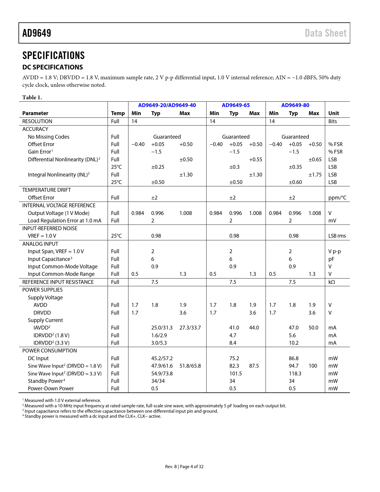 AD9649. Data Sheet. SPECIFICATIONS DC SPECIFICATIONS. Table 1. AD9649-20/AD9649-40. AD9649-65. AD9649-80. Parameter. Temp Min. Typ. Max. Min
