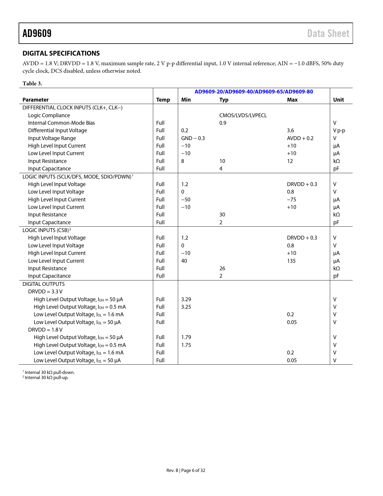 AD9609. Data Sheet. DIGITAL SPECIFICATIONS. Table 3. AD9609-20/AD9609-40/AD9609-65/AD9609-80. Parameter. Temp. Min. Typ. Max. Unit