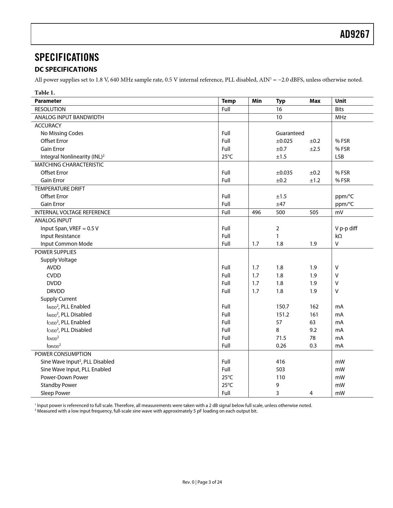 AD9267 SPECIFICATIONS DC SPECIFICATIONS Table 1 Parameter Temp Min Typ Max Unit