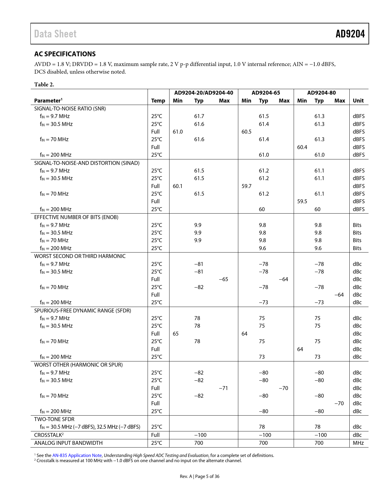 Data Sheet. AD9204. AC SPECIFICATIONS. Table 2. AD9204-20/AD9204-40 AD9204-65. AD9204-80. Parameter1 Temp. Min Typ