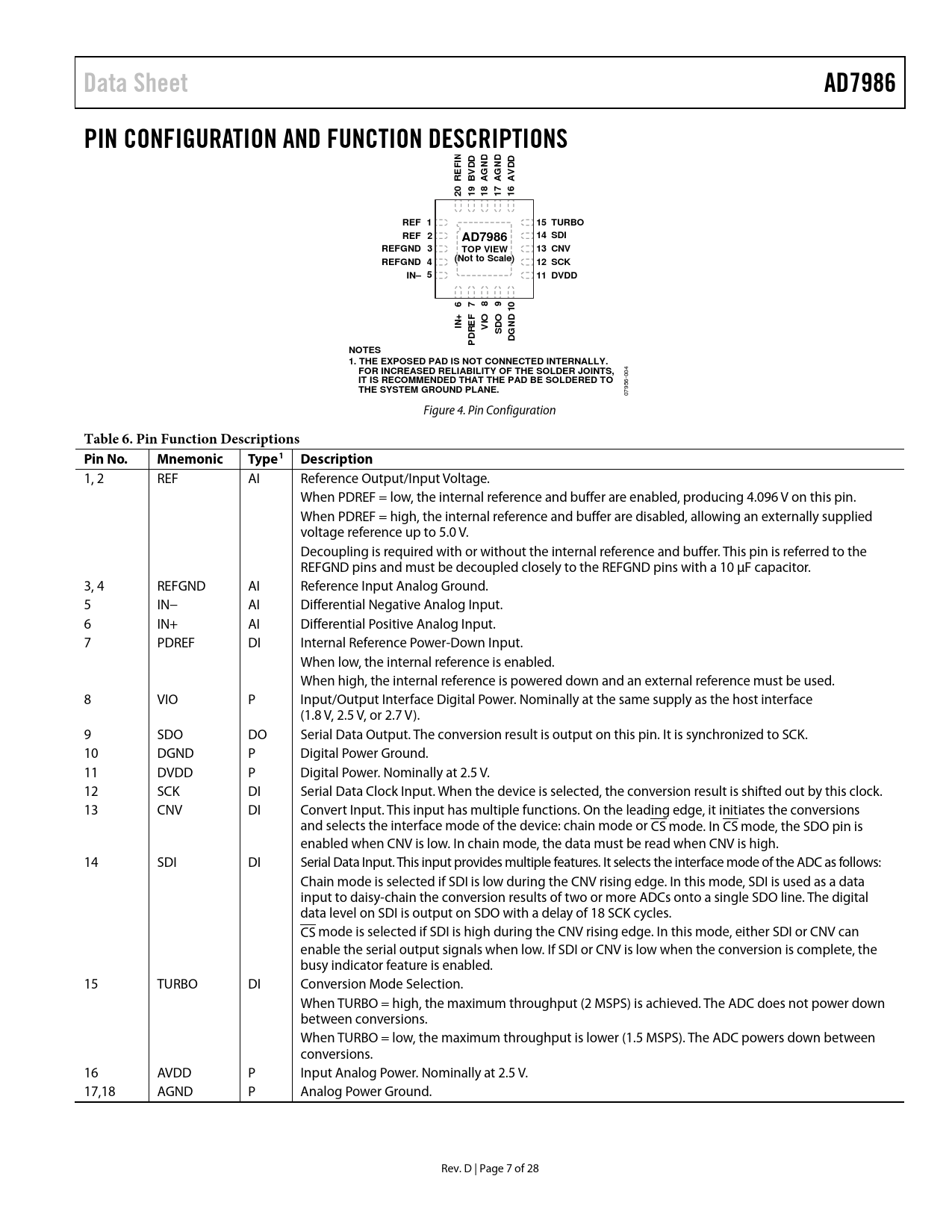 Data Sheet AD7986 PIN CONFIGURATION AND FUNCTION DESCRIPTIONS FIN E R REF 1 15 TURBO REF 2 14 SDI REFGND 3 TOP VIEW 13 CNV REFGND 4