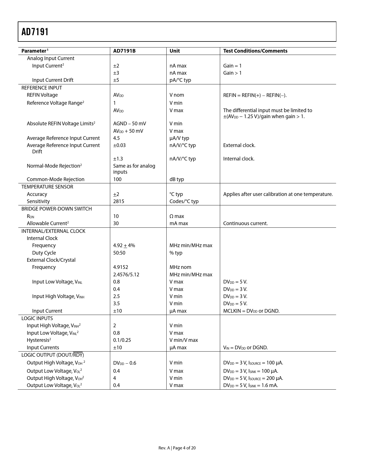 link to page 6 link to page 6 link to page 6 link to page 6 link to page 6 link to page 6 link to page 6 link to page 6 link to page 6 link to page 6 link to page 6 link to page 6 link to page 6 AD7191Parameter1AD7191BUnitTest Conditions/Comments Analog Input Current Input Current2 ±2 nA max Gain = 1 ±3 nA max Gain > 1 Input Current Drift ±5 pA/°C typ REFERENCE INPUT REFIN Voltage AVDD V nom REFIN = REFIN(+) − REFIN(−). Reference Voltage Range2 1 V min AVDD V max The differential input must be limited to ±(AVDD − 1.25 V)/gain when gain > 1. Absolute REFIN Voltage Limits2 AGND – 50 mV V min AVDD + 50 mV V max Average Reference Input Current 4.5 μA/V typ Average Reference Input Current ±0.03 nA/V/°C typ External clock. Drift ±1.3 nA/V/°C typ Internal clock. Normal-Mode Rejection2 Same as for analog inputs Common-Mode Rejection 100 dB typ TEMPERATURE SENSOR Accuracy +2 °C typ Applies after user calibration at one temperature. Sensitivity 2815 Codes/°C typ BRIDGE POWER-DOWN SWITCH RON 10 Ω max Allowable Current2 30 mA max Continuous current. INTERNAL/EXTERNAL CLOCK Internal Clock Frequency 4.92 + 4% MHz min/MHz max Duty Cycle 50:50 % typ External Clock/Crystal Frequency 4.9152 MHz nom 2.4576/5.12 MHz min/MHz max Input Low Voltage, VINL 0.8 V max DVDD = 5 V. 0.4 V max DVDD = 3 V. Input High Voltage, VINH 2.5 V min DVDD = 3 V. 3.5 V min DVDD = 5 V. Input Current ±10 μA max MCLKIN = DVDD or DGND. LOGIC INPUTS Input High Voltage, V 2 INH 2 V min Input Low Voltage, V 2 INL 0.8 V max Hysteresis2 0.1/0.25 V min/V max Input Currents ±10 μA max VIN = DVDD or DGND. LOGIC OUTPUT (DOUT/RDY) Output High Voltage, VOH 2 DVDD − 0.6 V min DVDD = 3 V, ISOURCE = 100 μA. Output Low Voltage, V 2 OL 0.4 V max DVDD = 3 V, ISINK = 100 μA. Output High Voltage, V 2 OH 4 V min DVDD = 5 V, ISOURCE = 200 μA. Output Low Voltage, V 2 OL 0.4 V max DVDD = 5 V, ISINK = 1.6 mA. Rev. A | Page 4 of 20 Document Outline FEATURES INTERFACE APPLICATIONS GENERAL DESCRIPTION FUNCTIONAL BLOCK DIAGRAM TABLE OF CONTENTS REVISION HISTORY SPECIFICATIONS TIMING CHARACTERISTICS TIMING DIAGRAM ABSOLUTE MAXIMUM RATINGS ESD CAUTION PIN CONFIGURATION AND FUNCTION DESCRIPTIONS TYPICAL PERFORMANCE CHARACTERISTICS RMS NOISE AND RESOLUTION SPECIFICATIONS ADC CIRCUIT INFORMATION OVERVIEW FILTER, DATA RATE, AND SETTLING TIME GAIN ANALOG INPUT CHANNELS TEMPERATURE SENSOR POWER-DOWN (PDOWN) CLOCK BIPOLAR CONFIGURATION DATA OUTPUT CODING BRIDGE POWER-DOWN SWITCH REFERENCE DIGITAL INTERFACE GROUNDING AND LAYOUT APPLICATIONS INFORMATION WEIGH SCALES EMI RECOMMENDATIONS OUTLINE DIMENSIONS ORDERING GUIDE