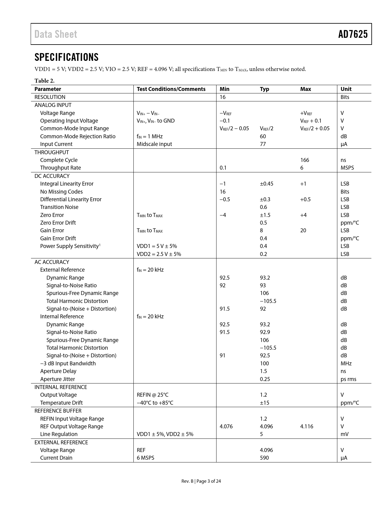 Data Sheet AD7625 SPECIFICATIONS Table 2 Parameter Test Conditions/Comments Min Typ Max Unit