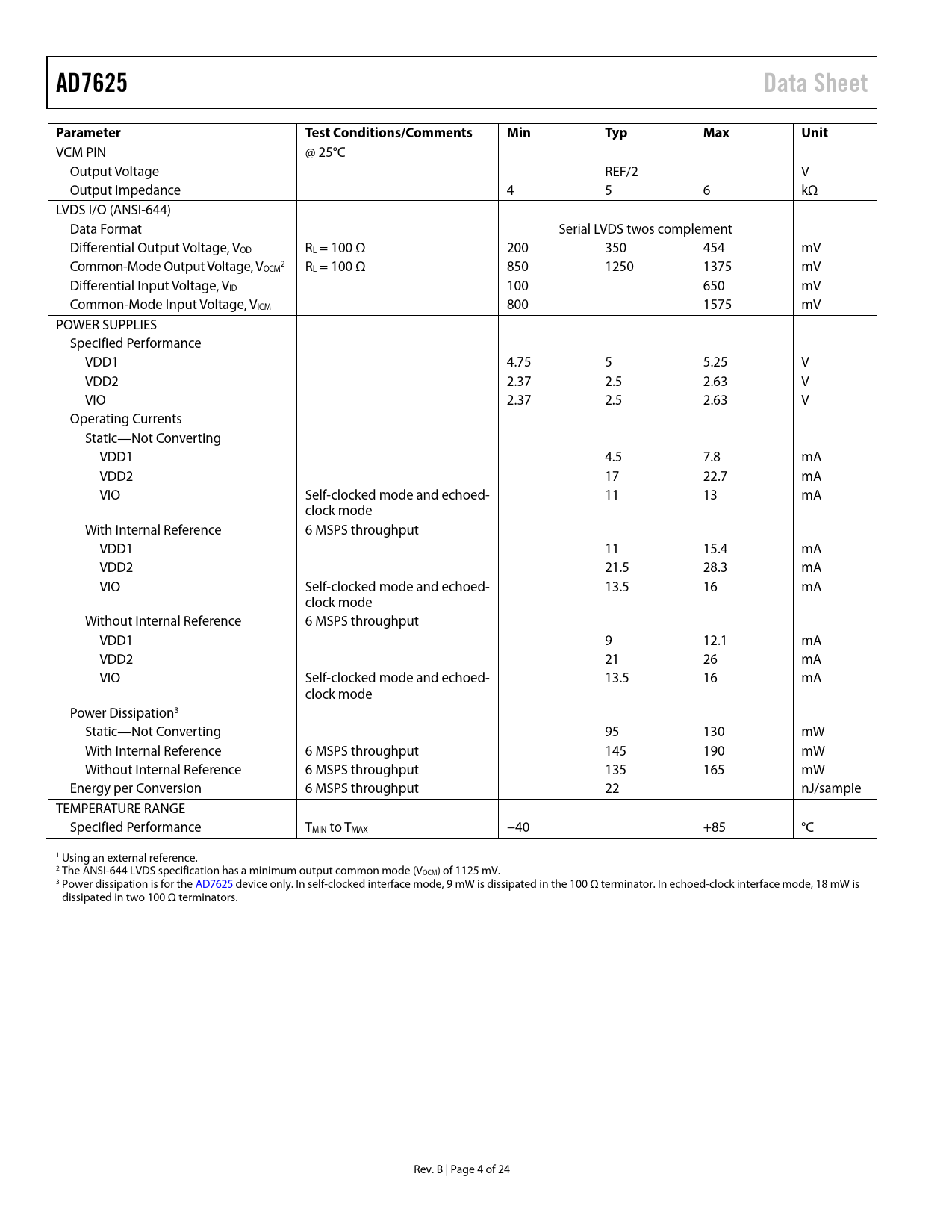 AD7625 Data Sheet Parameter Test Conditions/Comments Min Typ Max Unit