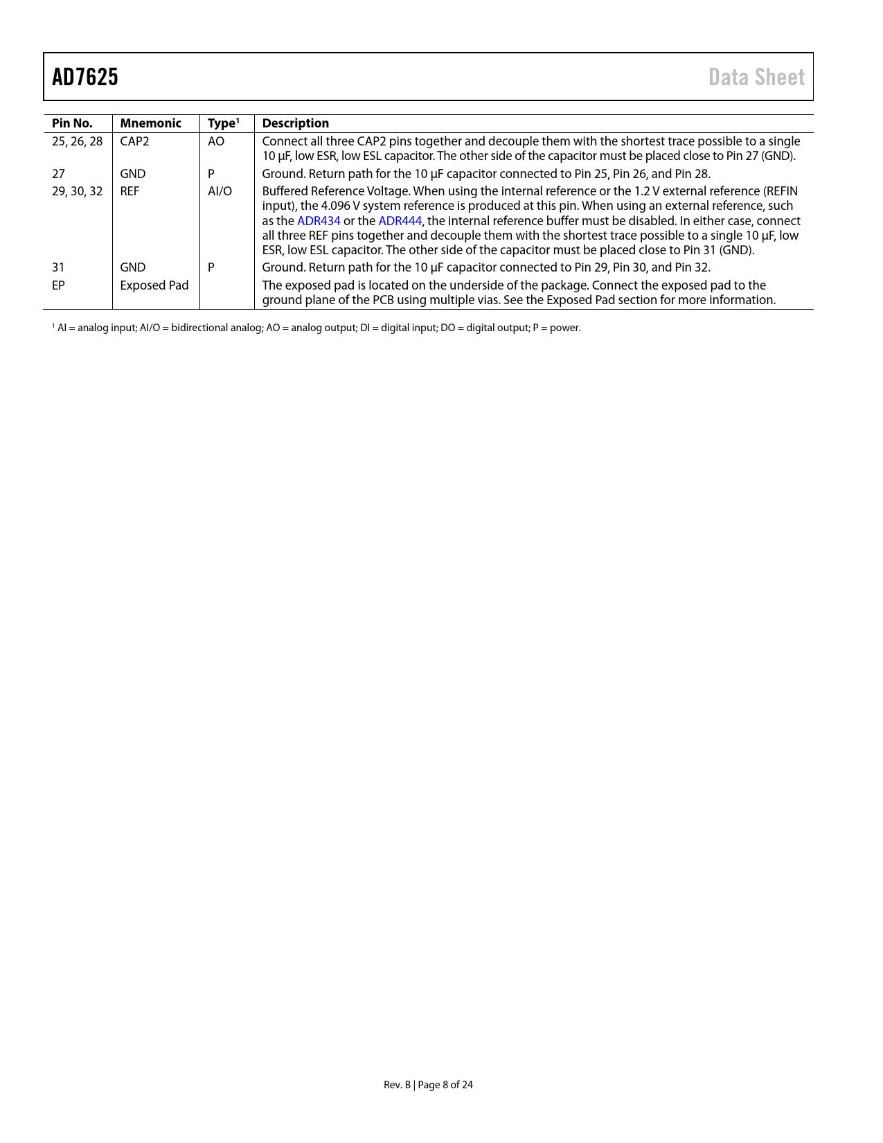 AD7625 Data Sheet Pin No Mnemonic Type1 Description