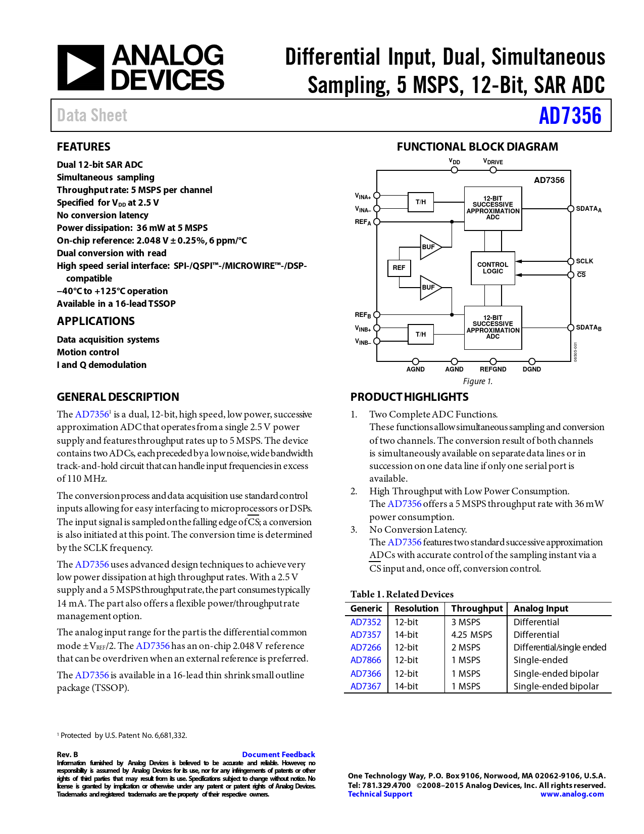 Differential Input, Dual, Simultaneous. Sampling, 5 MSPS, 12-Bit, SAR ADC. Data Sheet. AD7356. FEATURES. FUNCTIONAL BLOCK DIAGRAM