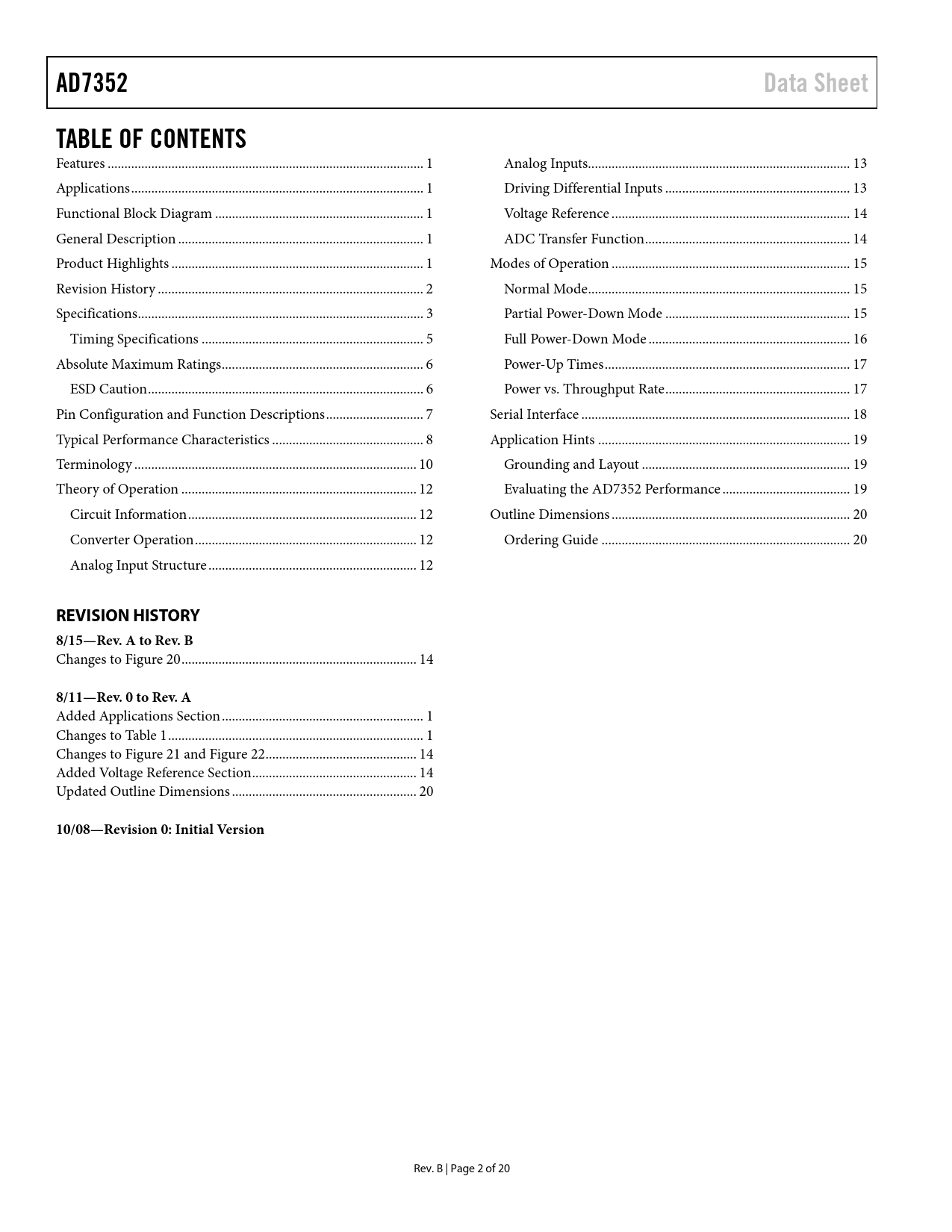 页数 / 页21 / 3 — AD7352. Data Sheet. TABLE OF CONTENTS. REVISION HISTORY 8/15—Rev. A to …