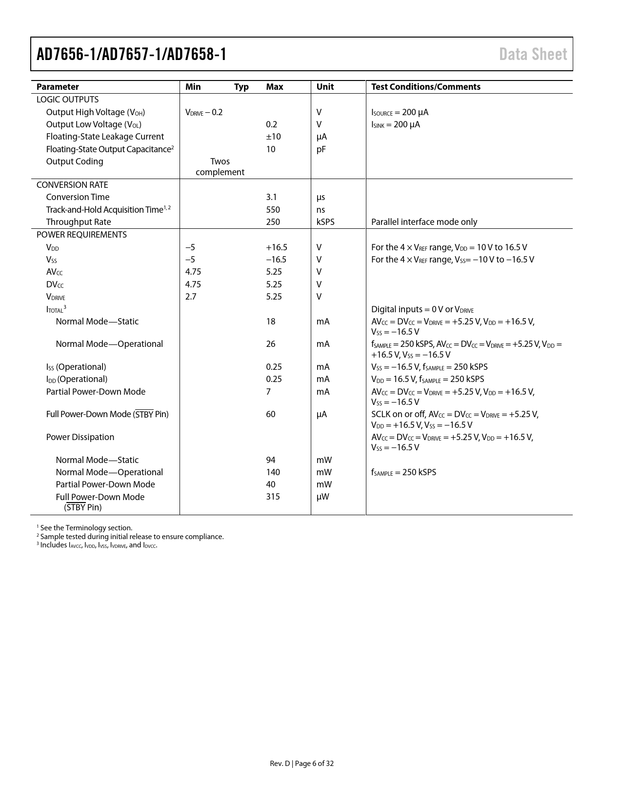 link to page 18 link to page 6 link to page 6 link to page 6 link to page 6 AD7656-1/AD7657-1/AD7658-1Data SheetParameterMinTypMaxUnitTest Conditions/Comments LOGIC OUTPUTS Output High Voltage (VOH) VDRIVE − 0.2 V ISOURCE = 200 µA Output Low Voltage (VOL) 0.2 V ISINK = 200 µA Floating-State Leakage Current ±10 µA Floating-State Output Capacitance2 10 pF Output Coding Twos complement CONVERSION RATE Conversion Time 3.1 µs Track-and-Hold Acquisition Time1, 2 550 ns Throughput Rate 250 kSPS Parallel interface mode only POWER REQUIREMENTS VDD −5 +16.5 V For the 4 × VREF range, VDD = 10 V to 16.5 V VSS −5 −16.5 V For the 4 × VREF range, VSS= −10 V to −16.5 V AVCC 4.75 5.25 V DVCC 4.75 5.25 V VDRIVE 2.7 5.25 V I 3 TOTAL Digital inputs = 0 V or VDRIVE Normal Mode—Static 18 mA AVCC = DVCC = VDRIVE = +5.25 V, VDD = +16.5 V, VSS = −16.5 V Normal Mode—Operational 26 mA fSAMPLE = 250 kSPS, AVCC = DVCC = VDRIVE = +5.25 V, VDD = +16.5 V, VSS = −16.5 V ISS (Operational) 0.25 mA VSS = −16.5 V, fSAMPLE = 250 kSPS IDD (Operational) 0.25 mA VDD = 16.5 V, fSAMPLE = 250 kSPS Partial Power-Down Mode 7 mA AVCC = DVCC = VDRIVE = +5.25 V, VDD = +16.5 V, VSS = −16.5 V Full Power-Down Mode (STBY Pin) 60 µA SCLK on or off, AVCC = DVCC = VDRIVE = +5.25 V, VDD = +16.5 V, VSS = −16.5 V Power Dissipation AVCC = DVCC = VDRIVE = +5.25 V, VDD = +16.5 V, VSS = −16.5 V Normal Mode—Static 94 mW Normal Mode—Operational 140 mW fSAMPLE = 250 kSPS Partial Power-Down Mode 40 mW Full Power-Down Mode 315 µW (STBY Pin) 1 See the Terminology section. 2 Sample tested during initial release to ensure compliance. 3 Includes IAVCC, IVDD, IVSS, IVDRIVE, and IDVCC. Rev. D | Page 6 of 32 Document Outline Features Applications Functional Block Diagram General Description Product Highlights Table of Contents Revision History Specifications AD7656-1 AD7657-1 AD7658-1 Timing Specifications Absolute Maximum Ratings Thermal Resistance ESD Caution Pin Configuration and Function Descriptions Typical Performance Characteristics Terminology Theory of Operation Converter Details Track-and-Hold Amplifiers Analog Input ADC Transfer Function Internal/External Reference Typical Connection Diagram Driving the Analog Inputs Interface Options Parallel Interface (SER/PAR SEL = 0) Software Selection of ADCs Changing the Analog Input Range (H/S SEL = 0) Changing the Analog Input Range (H/S SEL = 1) Serial Interface (SER/PAR SEL = 1) Serial Read Operation Daisy-Chain Mode (DCEN = 1, SER/ SEL = 1) Standby/Partial Power-Down Modes of Operation (SER/PAR SEL = 0 or 1) Application Hints Layout Power Supply Configuration Outline Dimensions Ordering Guide